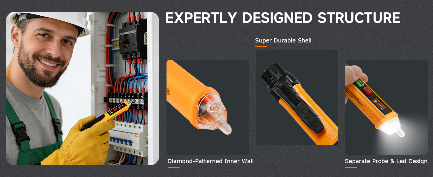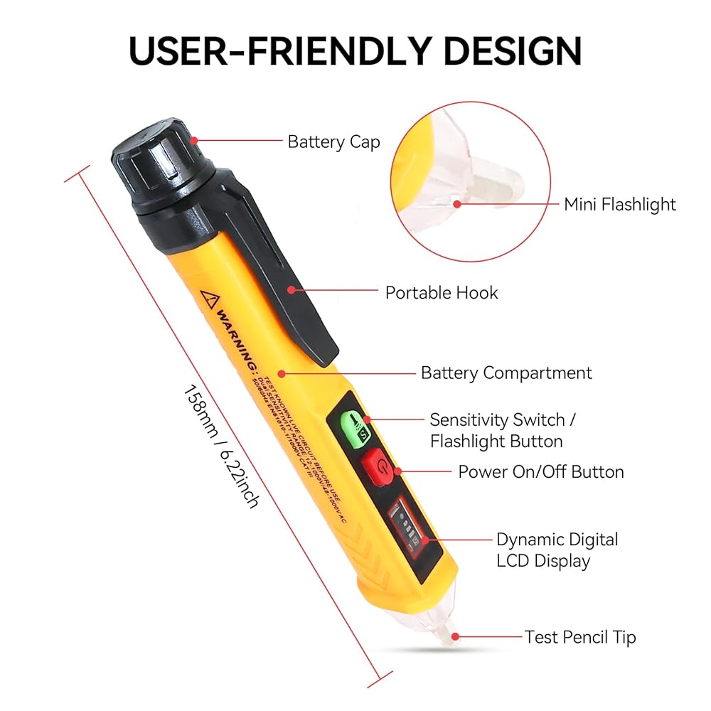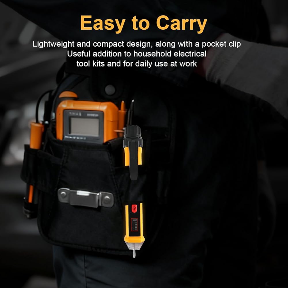 【تصميم متين وصغير الحجم】مجهز بمشبك جيب، يمكن ربط قلم كاشف الجهد الكهربائي هذا بسهولة بملابسك أو تخزينه في مجموعة أدوات، فهو أداة مدمجة ومحمولة. يتم إيقاف تشغيل قلم الاختبار الكهربائي تلقائيًا بعد 5 دقائق من عدم النشاط أو عدم اكتشاف إشارة للحفاظ على عمر البطارية. إذا كان لديك أي أسئلة، فلا تتردد في الاتصال بنا