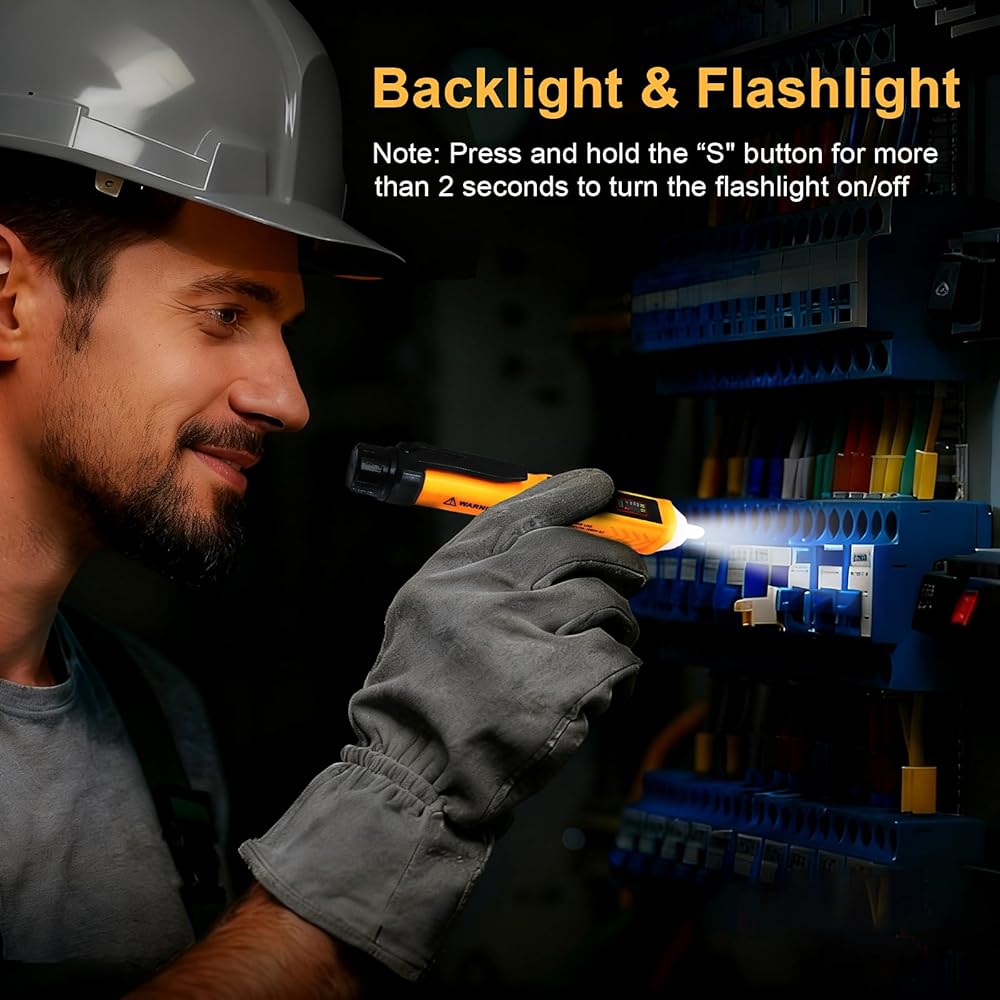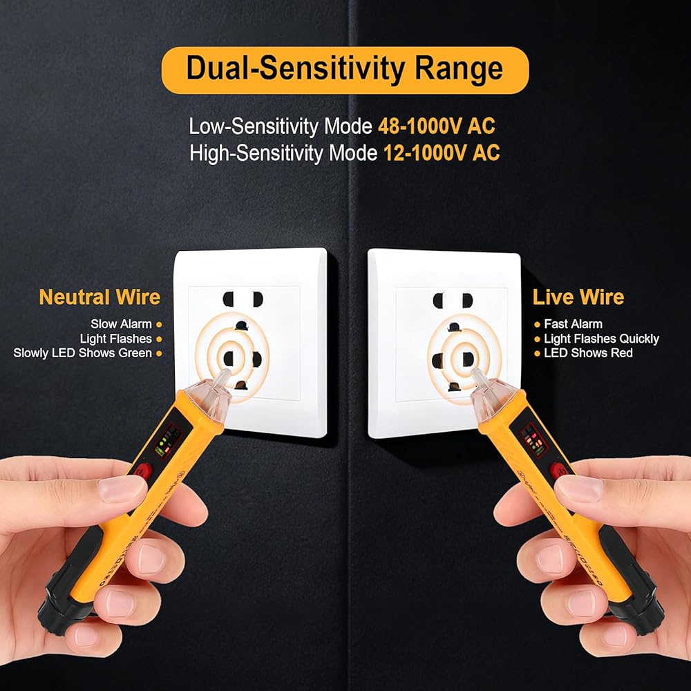 【نطاق حساسية مزدوج】يمكن لجهاز اختبار الجهد الكهربي غير المتصل هذا الكشف عن نطاق حساسية عالي يبلغ 12 فولت - 1000 فولت ونطاق حساسية منخفض يبلغ 48 فولت - 1000 فولت، مما يجعل القياس أكثر دقة ومرونة. اضغط على الزر "S" لتبديل وضع الحساسية المناسب بمرونة بناءً على مستوى الجهد للكائن الذي يتم اختباره. تصنيف السلامة: CAT IV 600V، CAT III 1000V