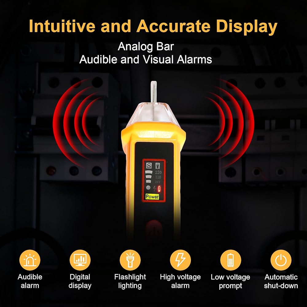 【شاشة LCD رقمية لمؤشر واضح】 يوفر جهاز اختبار الجهد الكهربائي هذا تنبيهات متعددة من خلال الصوت والضوء. عند اكتشاف الجهد، يضيء الطرف باللون الأحمر وتصدر الوحدة صوتًا. كلما كان الجهد المكتشف أعلى أو أقرب إلى مصدر الجهد، كلما كان تردد الصافرة أسرع. في نفس الوقت، يتحول شريط ضوء المؤشر الموجود على الشاشة إلى اللون الأحمر (يشير إلى الجهد العالي والسلك المباشر) أو الأخضر (يشير إلى الجهد المنخفض والسلك المحايد)