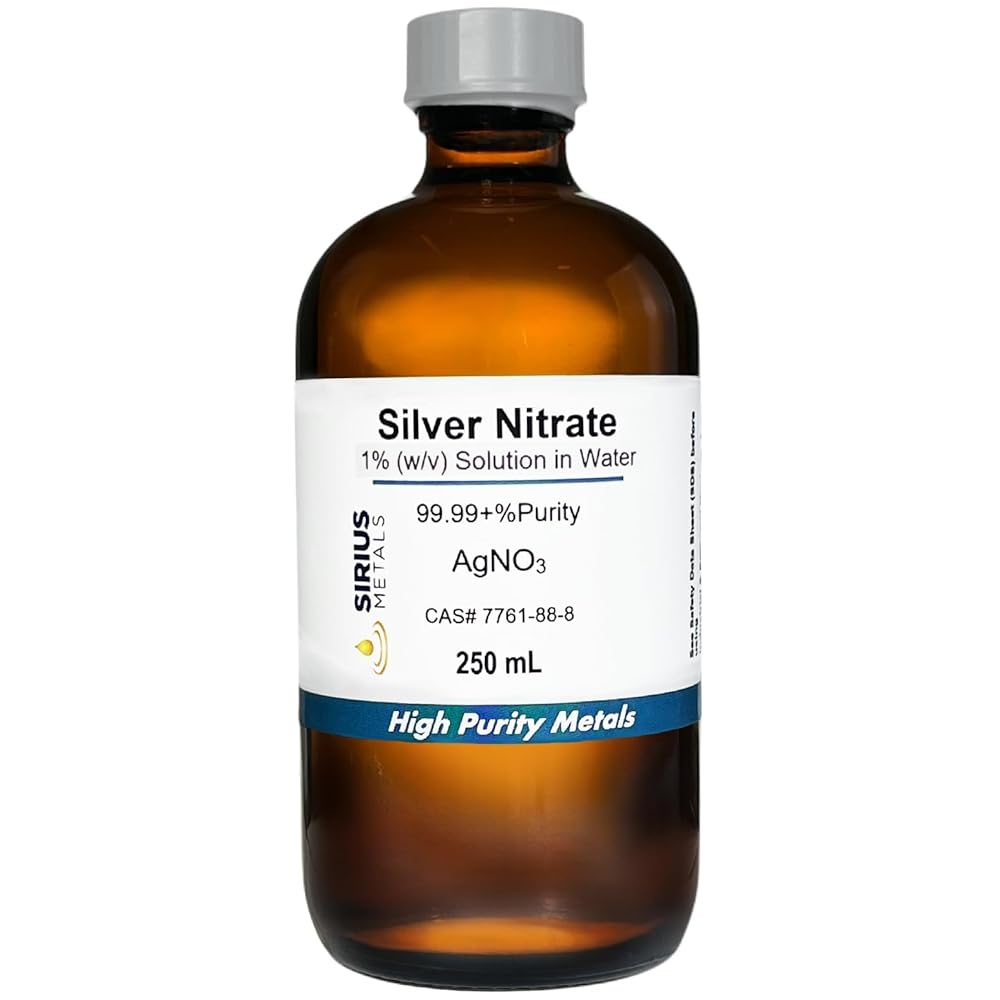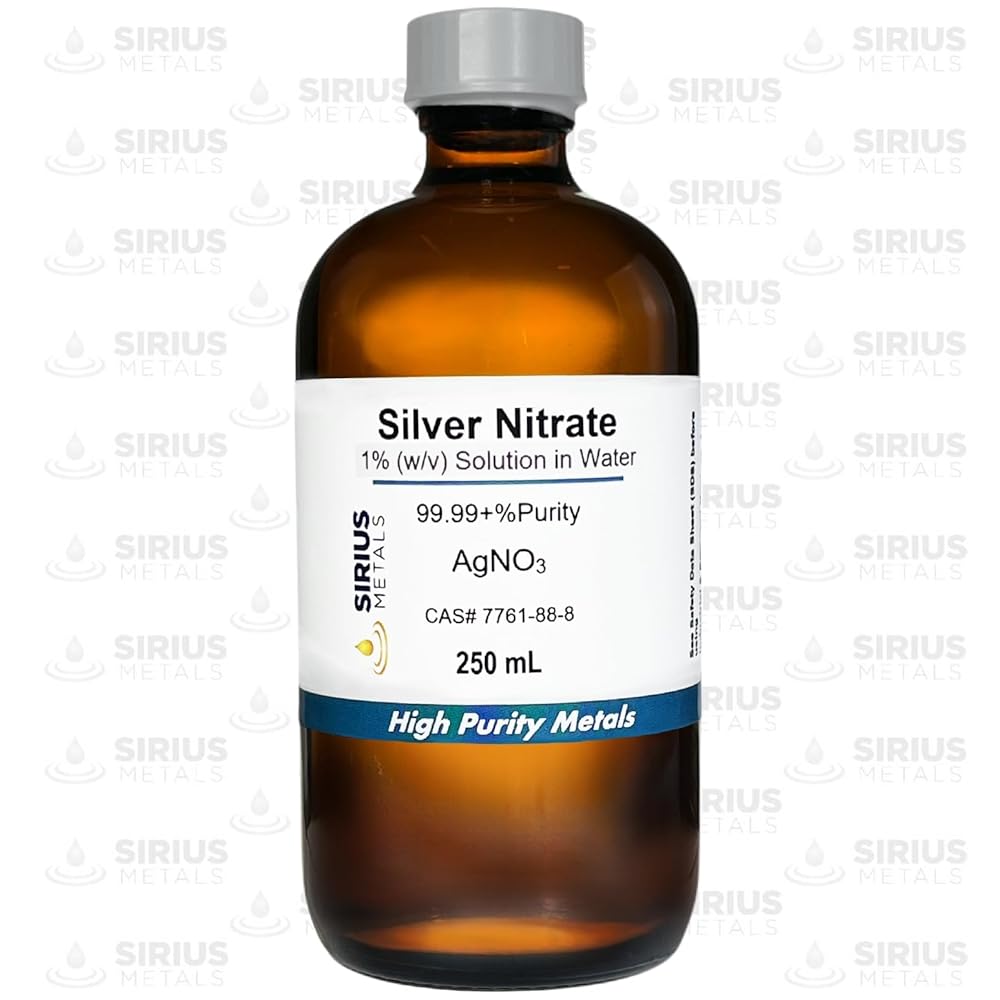 You are purchasing 250 mL of Sirius Metals manufactured 1.0% Silver nitrate (AgNO3) solution (0.635 % as 99.99+% pure Silver Metal) in a factory-sealed amber glass bottle with a phenolic safety cap