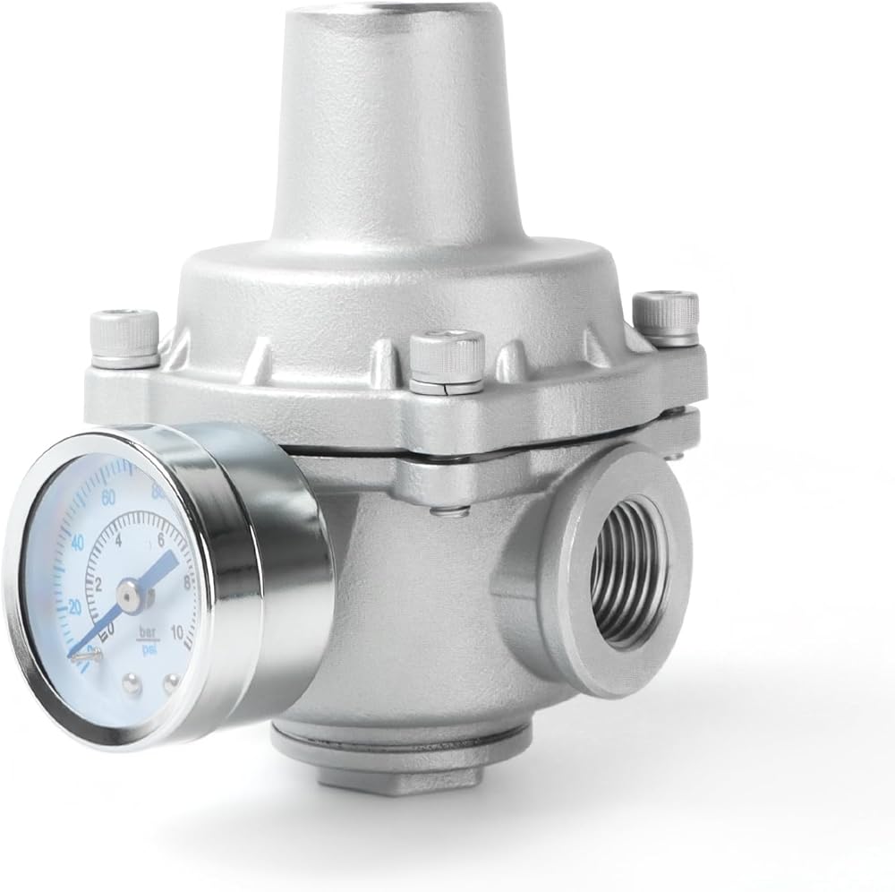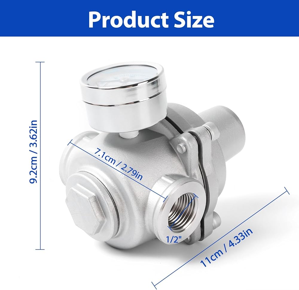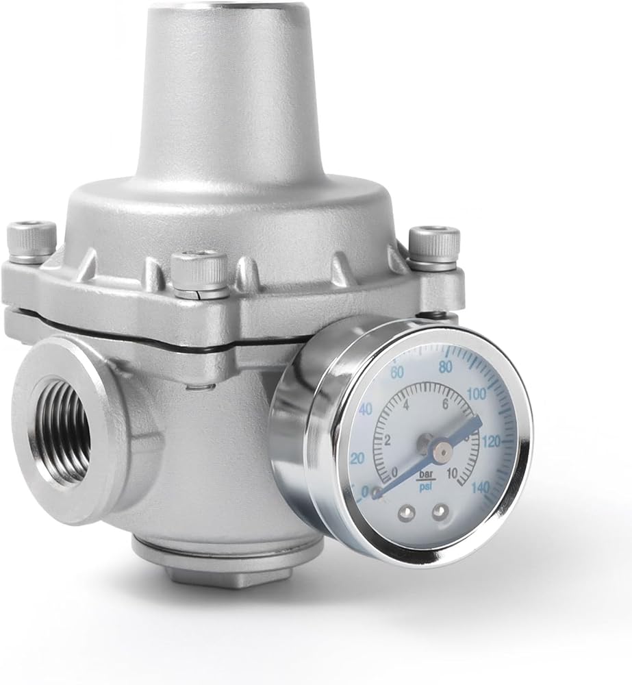 1. Precision Pressure Control & Real-Time Monitoring This water pressure regulator features a clear, integrated pressure gauge for instant visual feedback. The adjustable water pressure regulator allows you to finely tune output from 0-140 PSI with a simple screwdriver, providing reliable protection for plumbing systems against damaging high pressure. The precise pressure regulator valve mechanism ensures stable flow. 2. Industrial Durability with 304 Stainless Steel Built to last with a reinforced body made from premium, lead-free Stainless Steel 304. This robust construction offers superior rust resistance and strength, making this pressure reducing valve 1/2 inch suitable for demanding applications in Chemical Industry, food processing, and harsh environments, far outperforming standard brass valves. 3. Versatile & Multi-Purpose Application A true all-in-one solution for water pressure management. Functions perfectly as an RV water pressure regulator to protect your camper. Also ideal as a water regulator for garden irrigation systems, residential plumbing, and commercial water supply lines. This water pressure reducing valve ensures balanced pressure across various settings. 4. Easy Installation & Reliable Piston Design Designed for hassle-free setup. The 1/2" NPT female connections easily attach to standard male fittings—just follow the direction arrow for proper flow. Its advanced piston structure prevents jamming and ensures smooth, maintenance-free operation season after season, delivering consistent performance as a dependable pressure regulator valve. 5. Reliable Specifications & Wide Compatibility Features standard 1/2 inch NPT ports, a maximum inlet pressure of 240 PSI, and a working temperature range of -68°F to 212°F. This versatile pressure reducing valve is engineered for water applications in building supply, HVAC, and fire-fighting systems. It's the robust, professional-grade solution for both DIY homeowners and industrial users.
