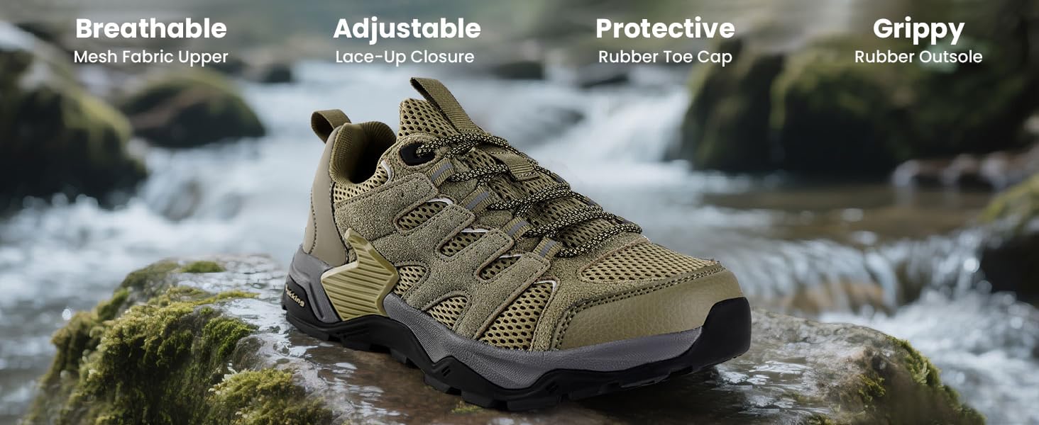 【حماية من الصدمات】 أحذية المشي لمسافات طويلة الخاصة بنا مدرعة بغطاء مطاطي مقوى لأصابع القدم، مما يحمي قدميك من التأثيرات غير المتوقعة مع الصخور والجذور وحطام الطريق.