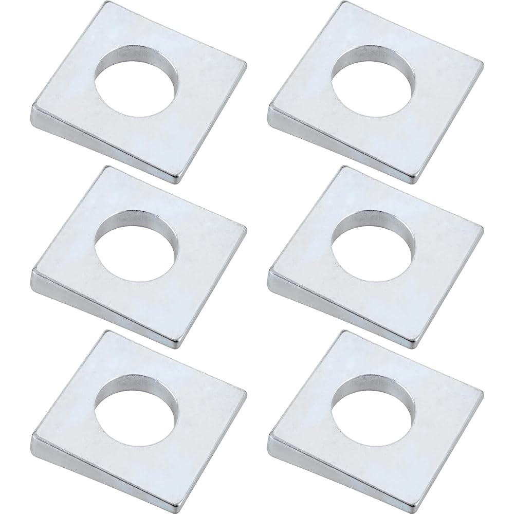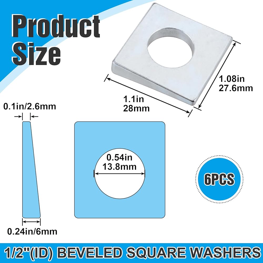 DC,CLISENCE 6 Pcs 1/2" Beveled Square Washers, 1-1/8" x 1-1/8" Plain Carbon Steel Galvanized Wedge Shaped Washer 2mm to 6.6mm Thick, Metal Shims for Leveling (Silver)