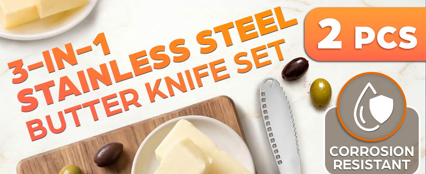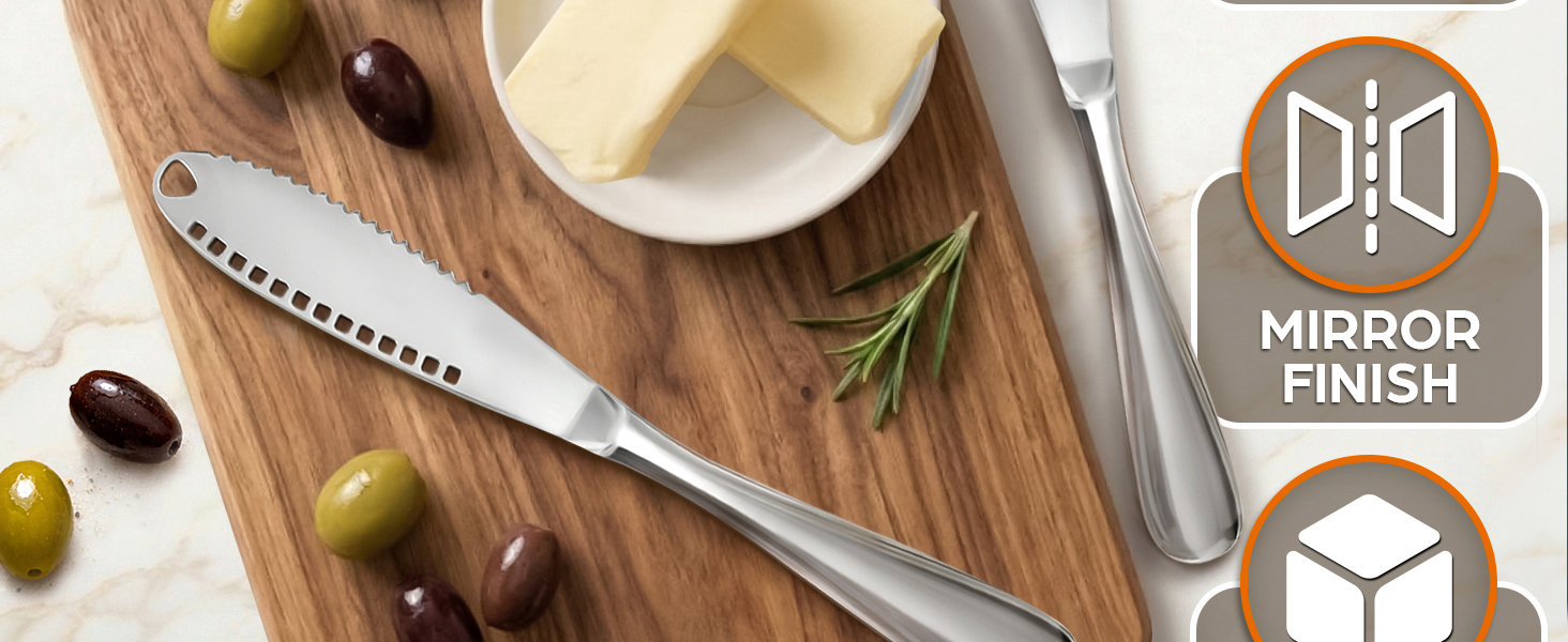 جودة سكين الزبدة للزبدة الصلبة: سكين الزبدة هذا المزود بفتحات في الشفرة مصنوع من الفولاذ المقاوم للصدأ المتين، ومقاوم للصدأ وآمن للاستخدام في غسالة الأطباق لسهولة التنظيف والاستخدام اليومي.