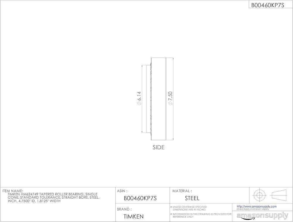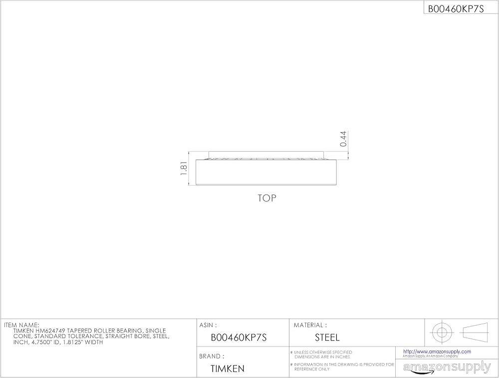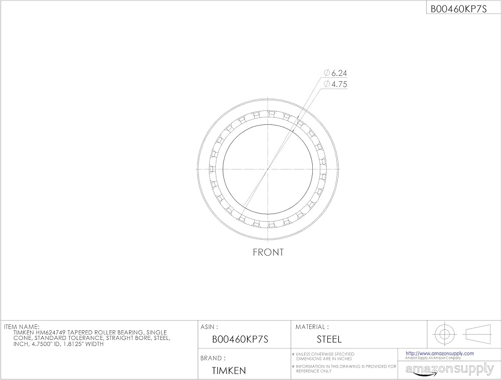 This Timken HM624700 Series single cone with a stamped steel cage matches with a single cup (outer ring, sold separately) to assemble into a complete single tapered roller bearing, suitable for applications that support both radial and axial loads. The cone assembly does not contract or expand under operating temperatures ranging from -54 to 120 degrees C (-65 to 250 degrees F). Generally mounted in opposing pairs on a shaft to evenly distribute loads, this single cone is made of Timken's own high-alloy steel for durability, heat tolerance, and resistance to deformity under heavy loads. The stamped steel cage prevents rollers from coming into contact with each other during use, reducing friction, vibration, and noise. As part of a separable tapered roller bearing unit, this single cone assembly has an open design that allows for lubrication and accurate adjustments. This single tapered roller bearing is for use in high-load, moderate-speed applications that include automotive axle systems and conveyor systems in heavy duty industries such as mining, construction and agriculture, among many other applications.
