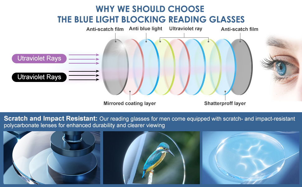 نظارات فلتر الضوء الأزرق: تستخدم نظارات حجب الضوء الأزرق تقنية العدسات الحاصلة على براءة اختراع لتقليل ما يصل إلى 34% من الضوء الأزرق المنبعث من أجهزة الكمبيوتر وأجهزة الكمبيوتر المحمولة والأجهزة اللوحية والهواتف الذكية