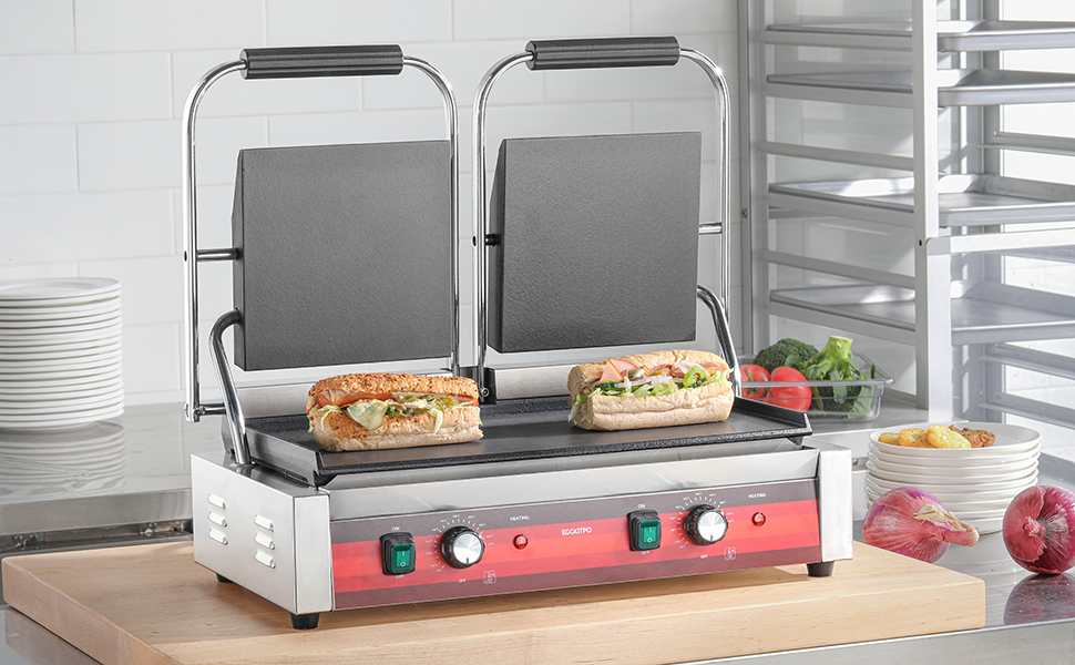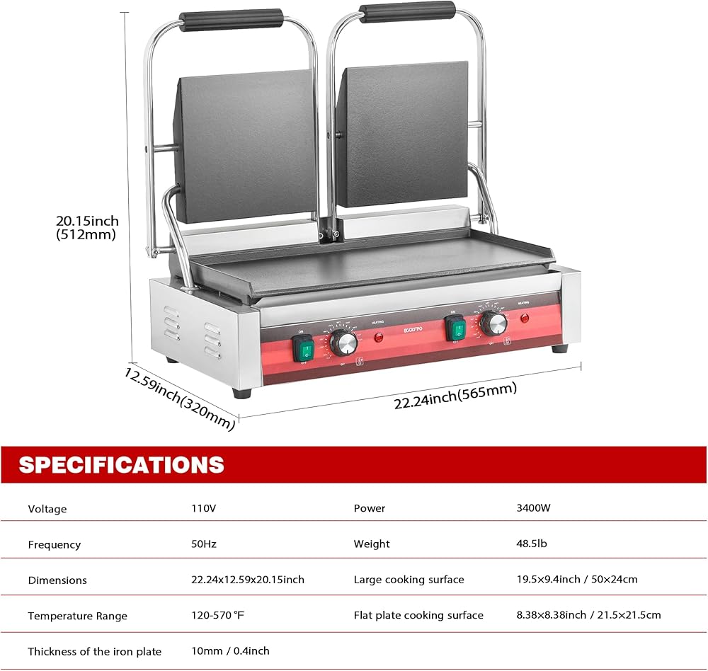 تسخين عالي الطاقة على الوجهين: تم تصميم صانع البانيني المزدوج هذا من الدرجة التجارية للحصول على أداء عالي الكفاءة. ماكينة تحضير البانيني مجهزة بمقبسين بقوة 110 فولت وقوة 3400 واط. باستخدام لوحتي التسخين العلوية والسفلية في الوقت نفسه، تخترق الحرارة الطعام بسرعة. يعد هذا مثاليًا بشكل خاص للمكونات الأكثر سمكًا، مما يضمن الحصول على مظهر خارجي متفحم تمامًا مع الحفاظ على الداخل طريًا وعصيرًا.
