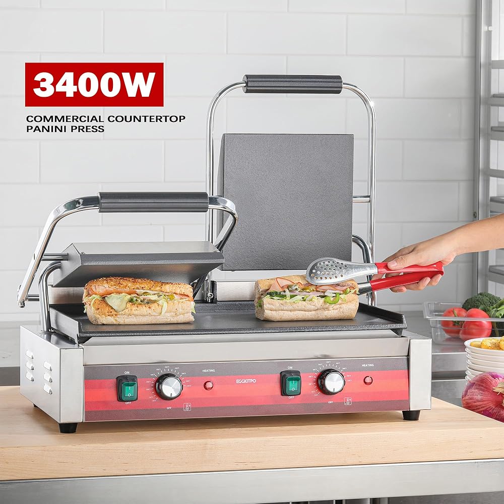 EGGKITPO شواية بانيني التجارية مع لوحات مخددة صانع الساندوتشات الكهربائية مع تحكم في درجة الحرارة قابل للتعديل 110 فولت 1700 واط 14 بوصة × 9.5 بوصة لوحات مينا مضلعة للإفطار والهامبرغر في المطبخ المنزلي