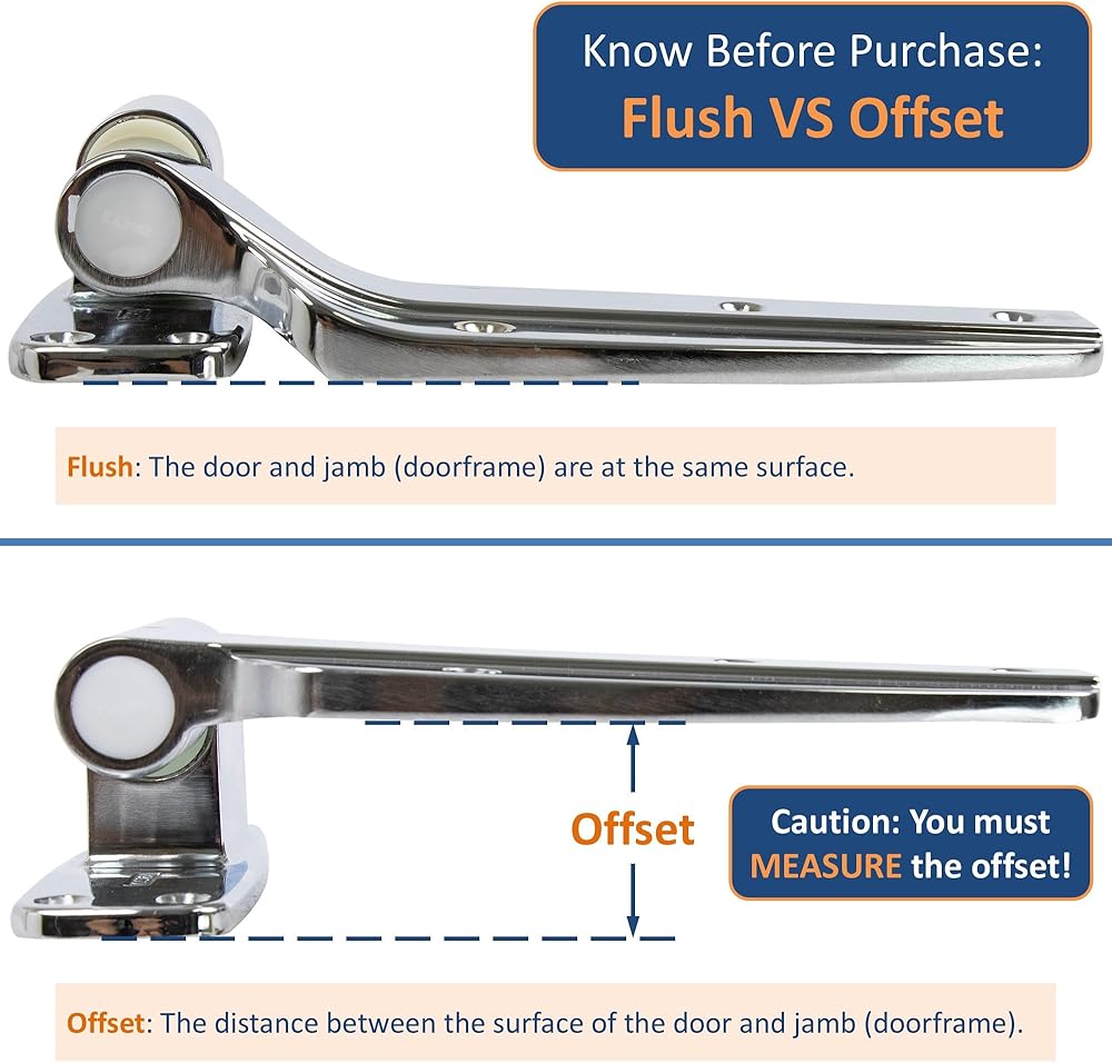 Flush vs Offset - Flush: the door and jamb (doorframe) are at the same surface. Offset means the distance between the surface of the door and jamb (doorframe). Follow the picture instructions to measure the offset accurately.