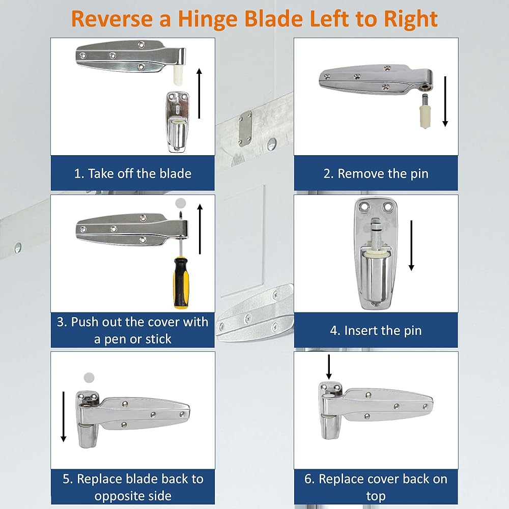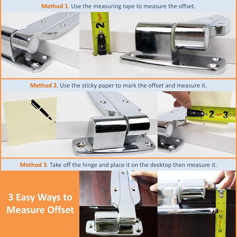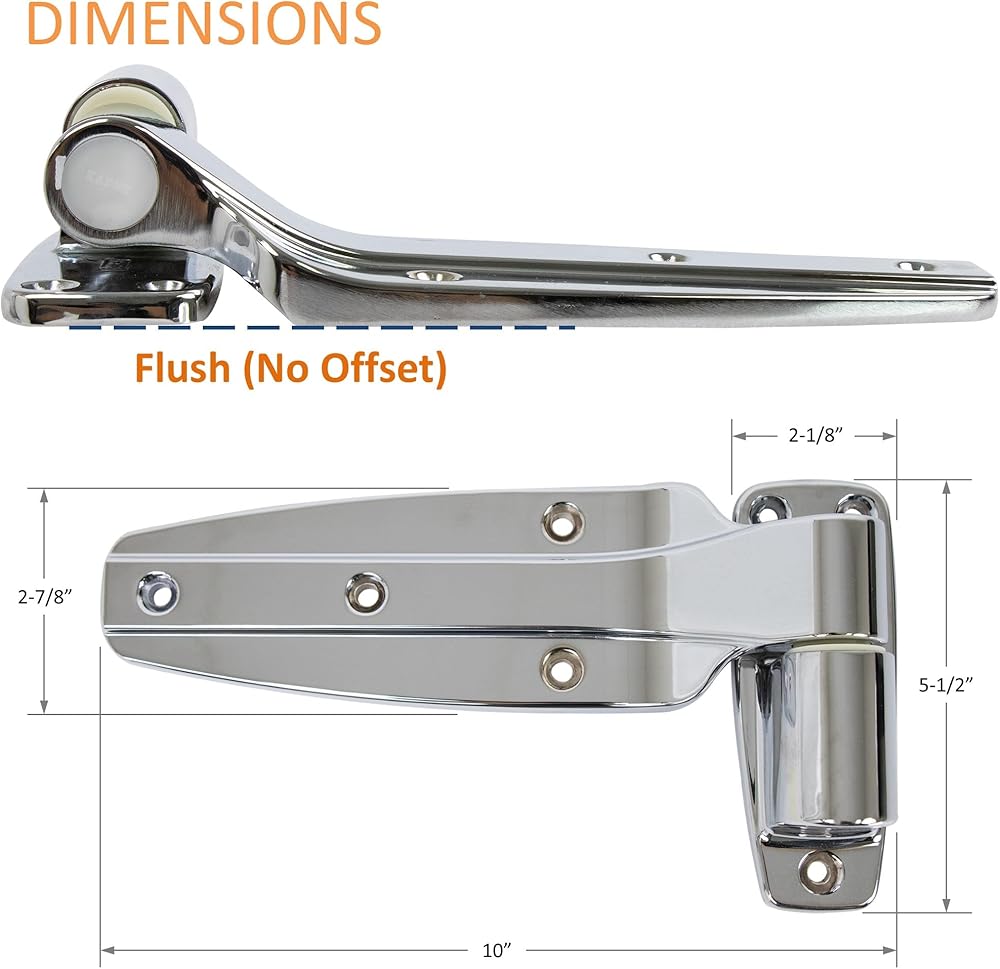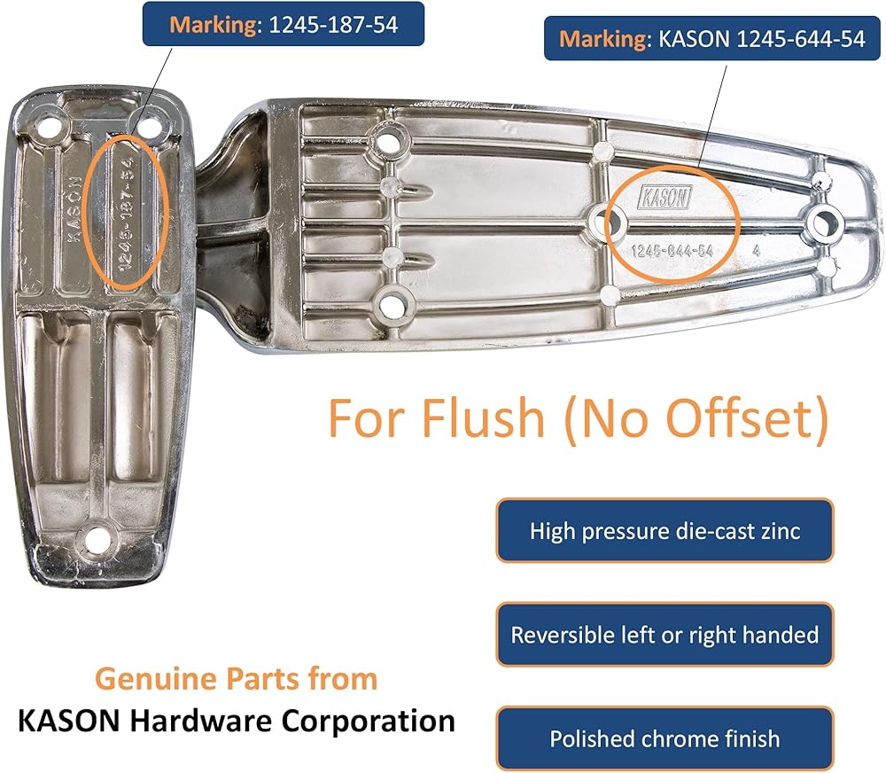 Features: Heavy duty and durable, smooth action for coolers, freezers and cold storage doors. Made with high pressure die cast zinc and self lubricating nylon cam with a polish chrome finish. Cam-rise action reduces gasket wear, even with irregular floors. Simple manual operation reverses hinges for use on right or left hand doors. Holes drilled and countersunk for 1/4” (6.0mm) screws. Built-in dwell holds door open beyond approximately 135 degrees and doors lift off without disassembly or removing hinges. Offset: Flush. Please refer to diagram for detailed size. Package includes: 1 x Kason 1245 Series Chrome Reversible Cam-Lift Hinge for Freezer/Cooler/Refrigerator (Offset: Flush)