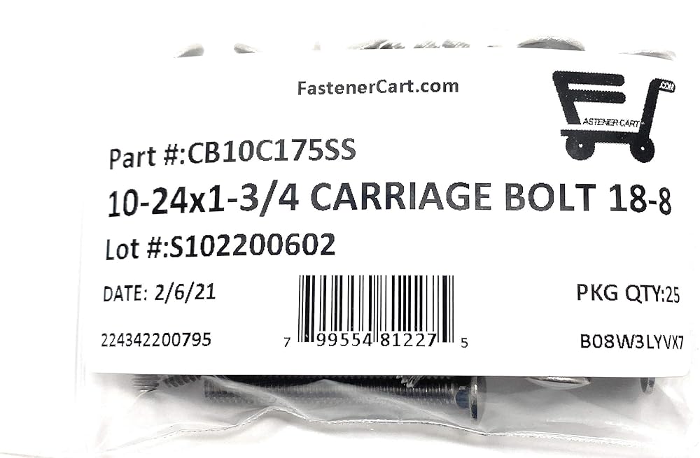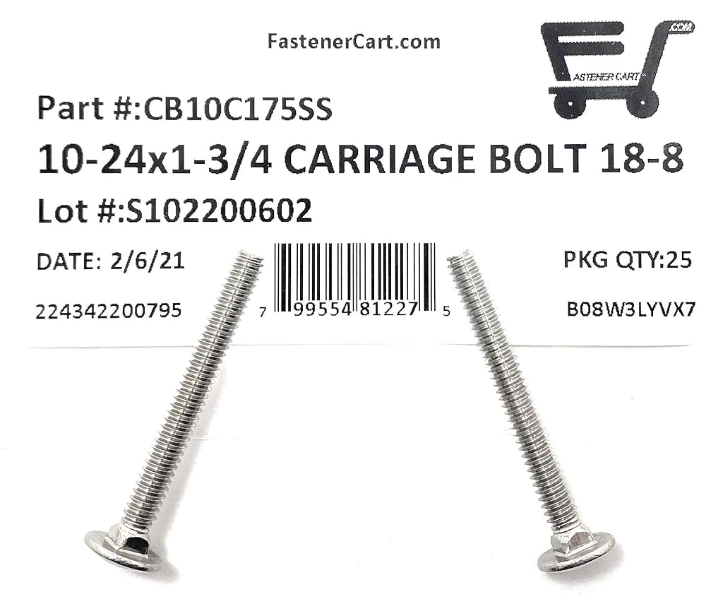 10-24x1-3/4 Carriage Bolts Stainless Steel 18-8 (25 Pieces)