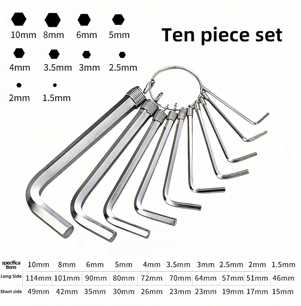 This comprehensive 10-piece hex key set features precisely crafted tools ranging from 1.5mm to 10mm, perfect for various maintenance and repair tasks. Made from premium Cr-V steel with a nickel-plated finish, these L-shaped hex wrenches offer superior durability and resistance to rust. The innovative keyring design keeps all tools organized and readily accessible, preventing loss during use. Each wrench features a long arm and short arm configuration for versatile access to fasteners in different situations. The set includes popular sizes: 1.5mm, 2mm, 2.5mm, 3mm, 3.5mm, 4mm, 5mm, 6mm, 8mm, and 10mm. These tools are ideal for bicycle maintenance, furniture assembly, automotive work, and general repairs. The flat-head design provides maximum contact surface for improved torque application, while the 90-degree bend allows for effective leverage in tight spaces. The compact and lightweight design makes this set perfect for both professional mechanics and DIY enthusiasts who need reliable tools for various applications.