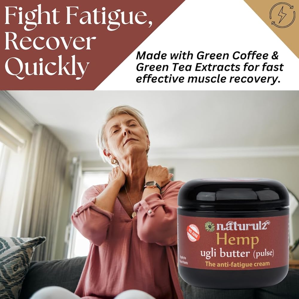 Ugli Butter Pulse- MUSCLE RECOVERY FORMULA- with Oregon Grown hemp and invigorating Green coffee extract, Green tea, Gingko, Maca, Turmeric, Clover and more for a balanced muscle recovery topical that mels on contact with the skin, soothes sore and overworked areas and delievers plant-based adaptogenic nourishment. Great for those who work on their feet, Athletes, Construction workers and those who deal with low energy levels. PRO TIP: Apply to Pulse points (specifically the neck) before and after work or exercise.