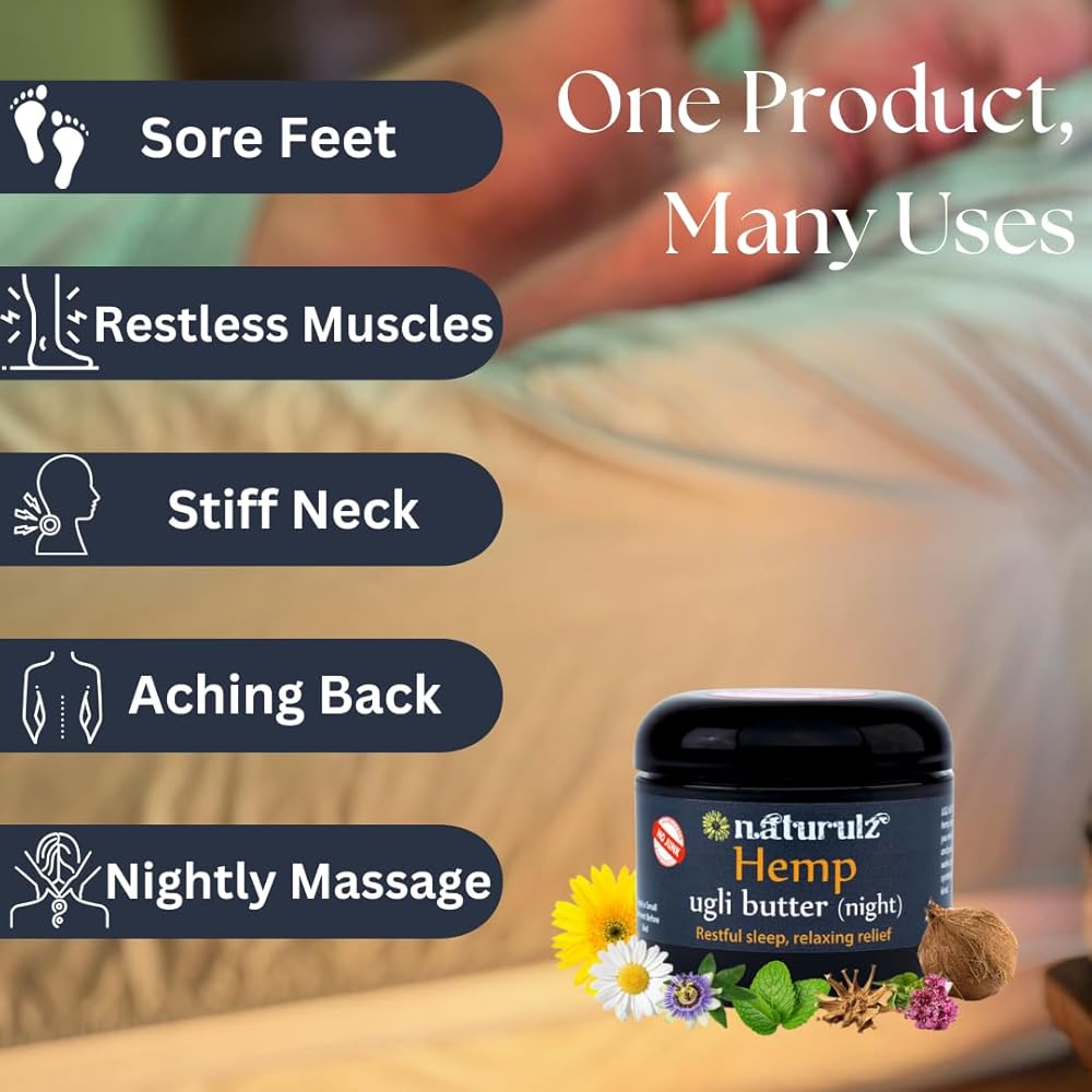Ugli Butter night- RESTFUL NIGHT FORMULA -with Oregon Grown hemp is made and soothing plant botanicals including Lavender, Chamomile, Passionflower, Devils Claw, Peppermint, Ginger and more all Blended into Coconut Oil for an Easy-to Apply, Deeply Nourishing topical for sore & restless muscles and joints. PRO TIP: Apply to the bottom of your feet and back of your neck 10-15 minutes before rest.
