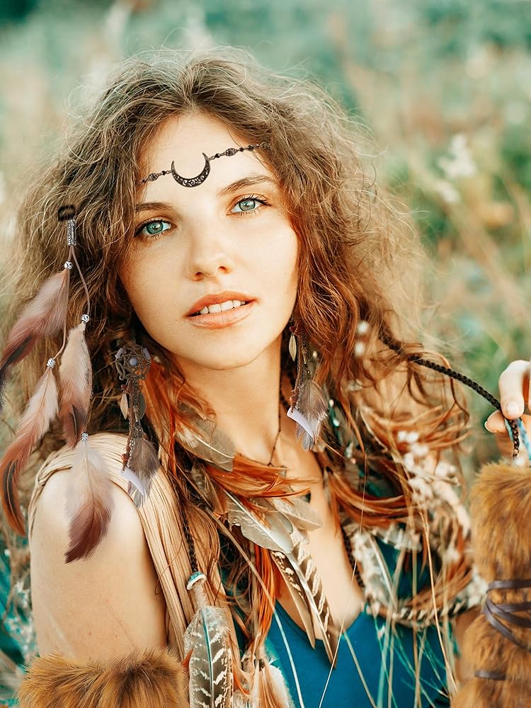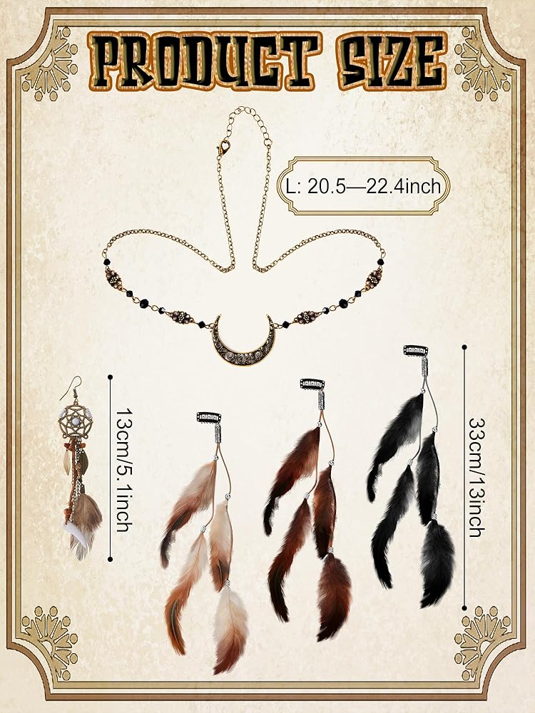مجموعة زي بانيتاي فايكنغ للنساء من الفرو الصناعي لتدفئة الساق وأساور المعصم مع حزام قطعتين من سلسلة رأس القمر العتيقة من بوهو وأقراط طويلة من الريش و3 قطع من مشابك شعر الريش لحفلات الهالوين