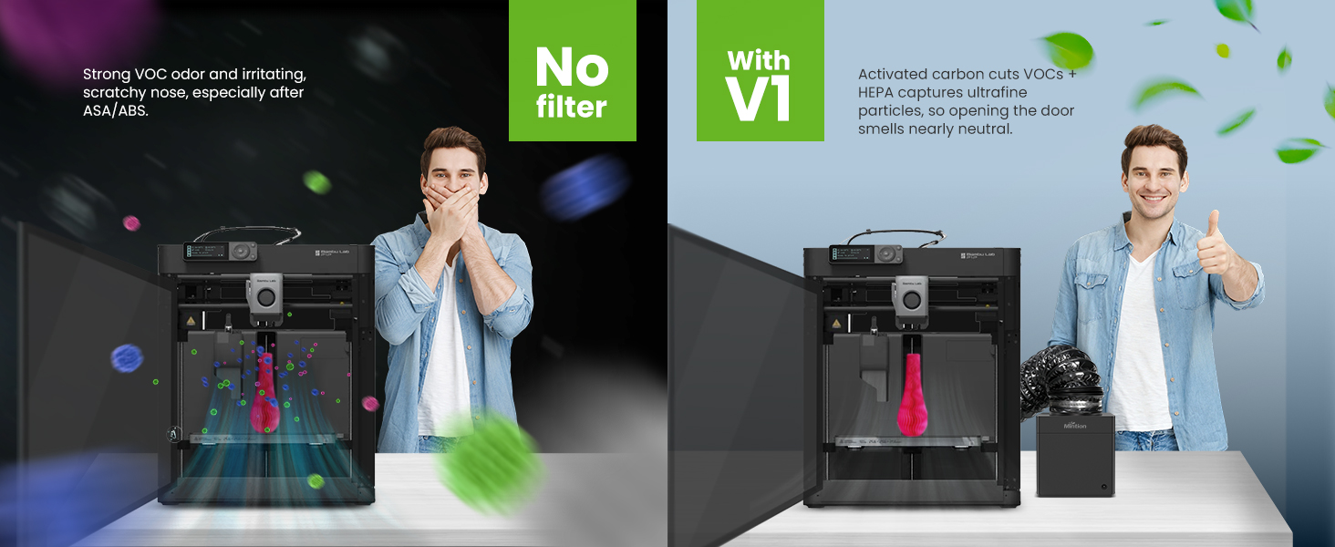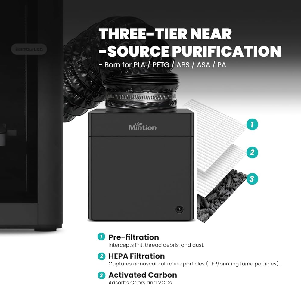 【حماية شاملة للخيوط】نظام Mintion V1 مناسب لجميع الشعيرات الشائعة، بما في ذلك PLA، وPETG، وABS، وASA، والنايلون (PA). فهو يقلل بشكل كبير من الروائح والانبعاثات الناتجة عن المواد ذات المركبات العضوية المتطايرة العالية، مما يجعله مثاليًا للاستخدام في المنازل والاستوديوهات والمؤسسات التعليمية والبيئات المهنية.
