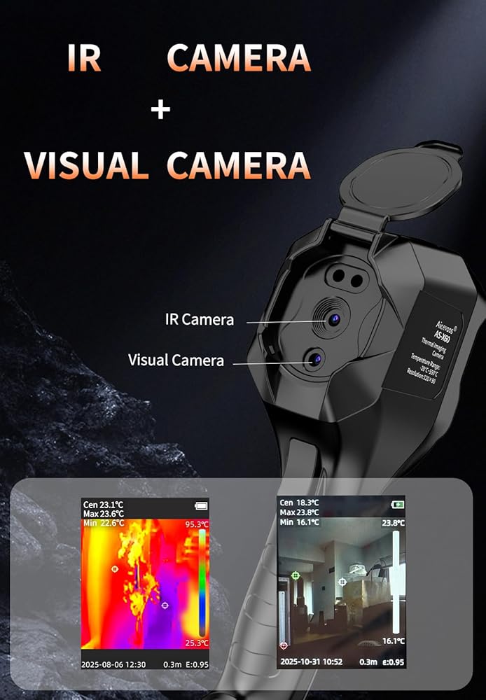 【ربط الضوء المزدوج 】 يتميز التصوير الحراري X60 بعدسة ضوء مرئية عالية الوضوح مع معدل تحديث يصل إلى 25 هرتز. فهو يوفر ثلاثة أوضاع لقياس درجة الحرارة: النقطة المركزية، ودرجة الحرارة القصوى، ودرجة الحرارة الدنيا، ويدعم تسجيل الفيديو لتلبية احتياجاتك لتوثيق المشاهد غير الطبيعية!