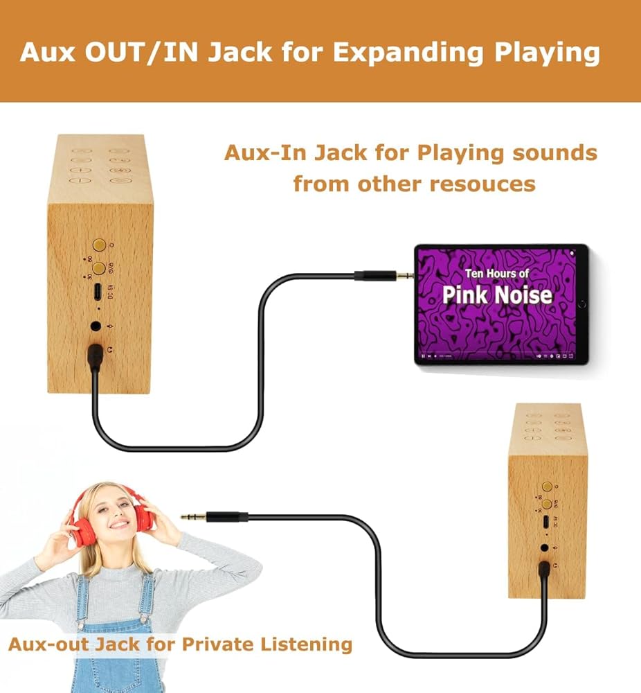 • مقبس سماعة الرأس ودعم Aux-in - مع مخرج سماعة رأس مخصص يمكنك الاستمتاع بمنطقة نومك الشخصية دون إزعاج الآخرين. يتيح لك مقبس Aux-in توصيل الأجهزة الخارجية وتشغيل قوائم تشغيل النوم أو التأمل الخاصة بك، مما يحول جهاز الصوت هذا إلى مركز صوت مرن.