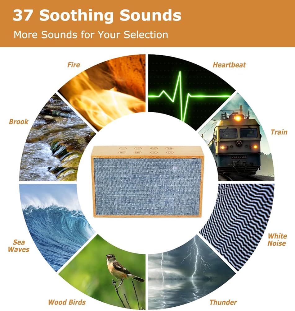 • 37 صوتًا مهدئًا غير متكرر - يتميز بـ 37 صوت نوم مهدئ وغير متكرر عبر 3 فئات - 5 أصوات بيضاء، و5 أصوات مروحة، و27 مسارًا طبيعيًا غامرًا مثل أمواج المحيط، والمطر، والطيور، ونيران المخيم، والشلال. كل صوت واضح تمامًا وخالي من الحلقات، مما يخلق بيئة هادئة للاسترخاء العميق.