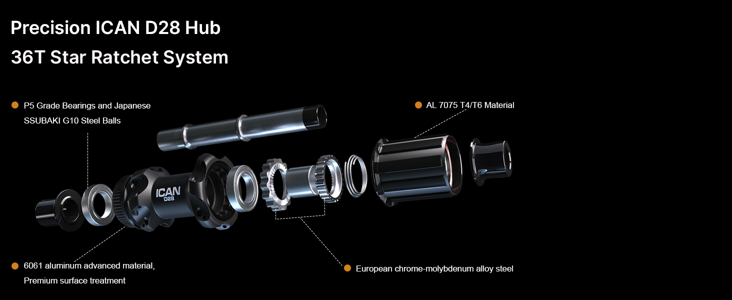Equipped with a 36T Ratchet System, the ICAN D28 hub ensures quick engagement and precise power transfer, compatible with Road HG 10/11/12-speed and XDR freehub options.