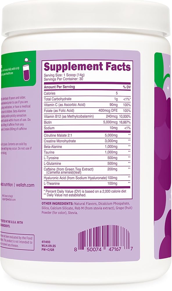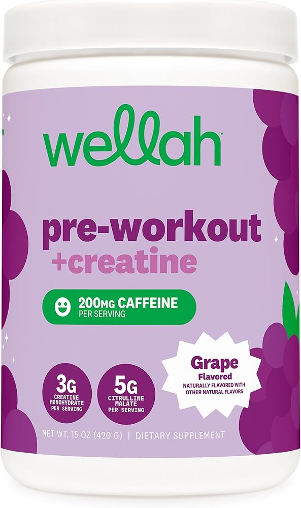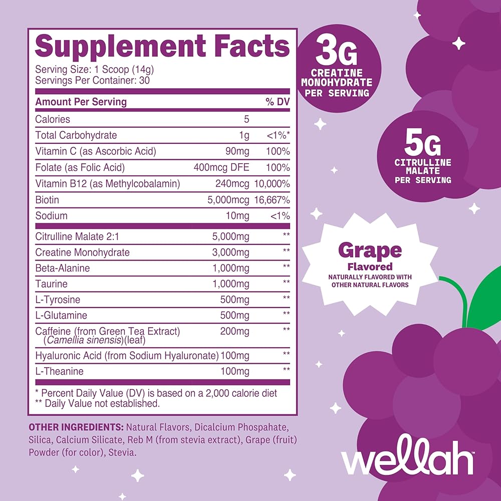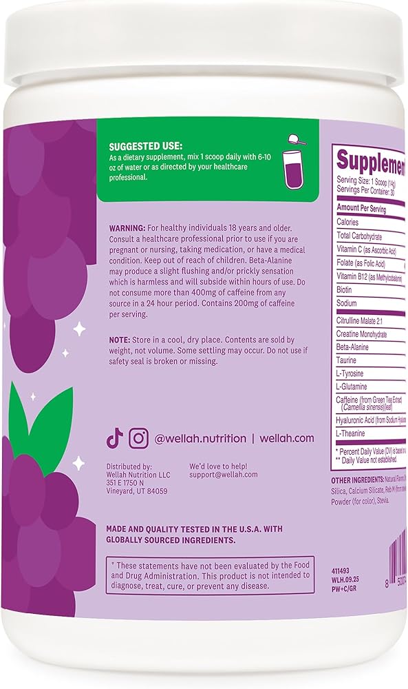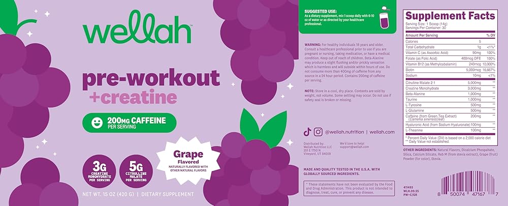 Wellah ما قبل التمرين + مسحوق الكرياتين (30 حصة) العنب - 200 مجم كافيين، 3 جم كرياتين مونوهيدرات، 5 جم سيترولين مالات، ما قبل التمرين مع مكمل الكرياتين