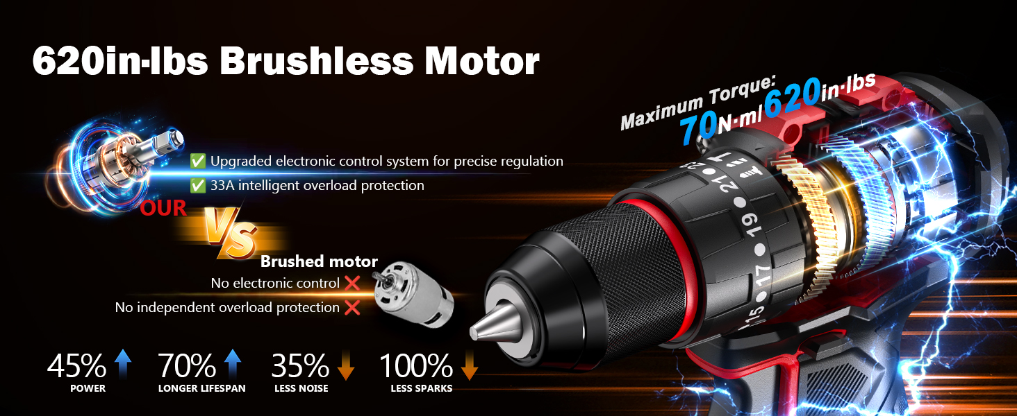 • محرك قوي بدون فرش: تم تجهيز مثقاب Sundpey اللاسلكي المزود ببطارية وشاحن بمحرك عالي الكفاءة بدون فرش يوفر ما يصل إلى 620 رطلًا (70 نيوتن متر) من عزم الدوران وما يصل إلى 19000 نبضة في الدقيقة، مما يسمح لك بمعالجة مجموعة واسعة من المهام بسهولة. بالمقارنة مع المحركات المصقولة التقليدية، فإنها تولد طاقة أكبر بنسبة 45%، وتطيل عمر الخدمة بنسبة 70%، وتعمل بشكل أكثر هدوءًا بنسبة 35%، وتعمل بدون شرارة تمامًا، مما يضمن أداء أكثر أمانًا وموثوقية في كل وظيفة.