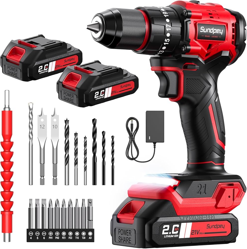 مجموعة مثقاب كهربائي لاسلكي من Sundpey - 620 رطلًا 23+3 مثقاب كهربائي بدون فرشاة مع بطارية 2 × 2.0 أمبير وإضاءة LED وظرف معدني 3/8 بوصة وشاحن سريع - مفك براغي كهربائي للمنزل والأعمال الخشبية للرجال والنساء