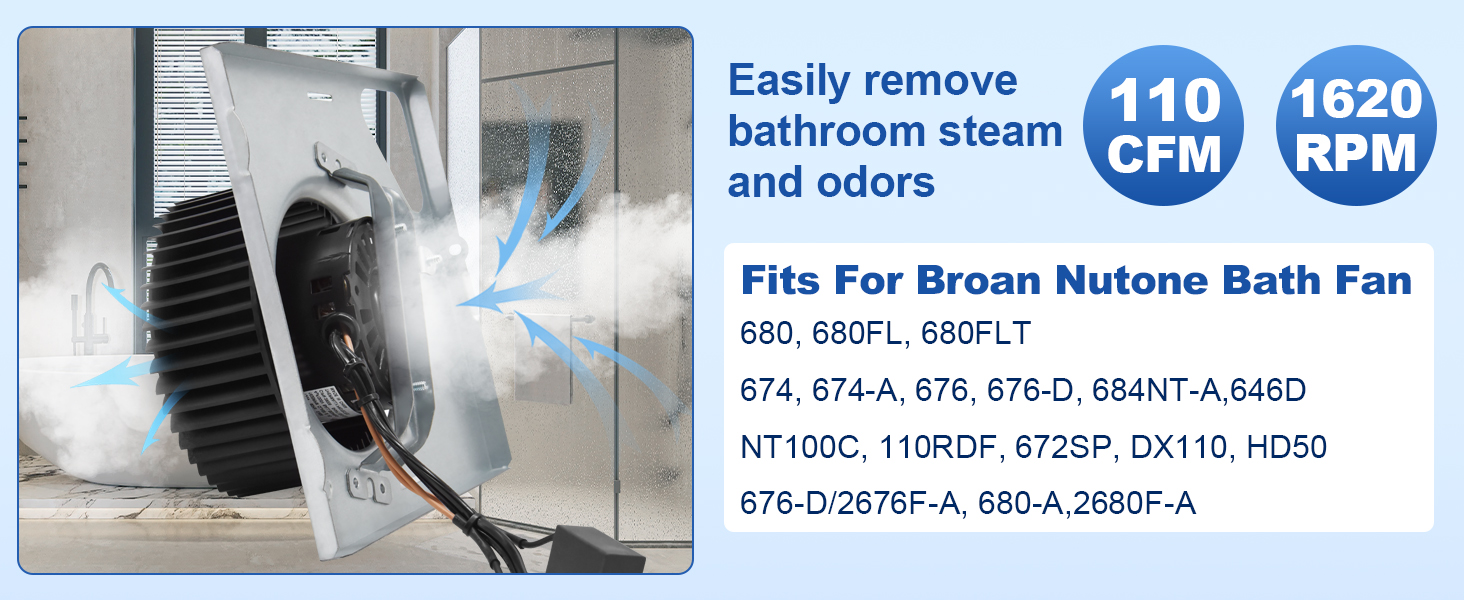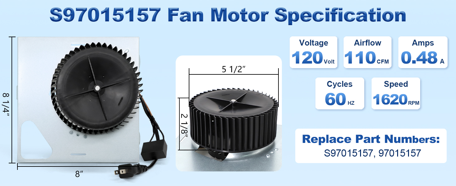 قم بترقية نظام التهوية الخاص بك: 110 قدم مكعب في الدقيقة، استخدم مجموعة محرك مروحة العادم S97015157 لطرد الهواء الرطب والروائح الكريهة في الحمام بشكل فعال وسريع، والتخلص بسرعة من الضباب على سطح المرآة، وضمان بيئة منعشة وجيدة التهوية وجافة، وتحسين الراحة بعد الاستحمام وجودة الهواء الداخلي بشكل عام.