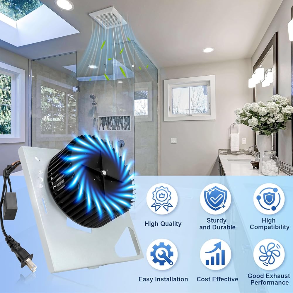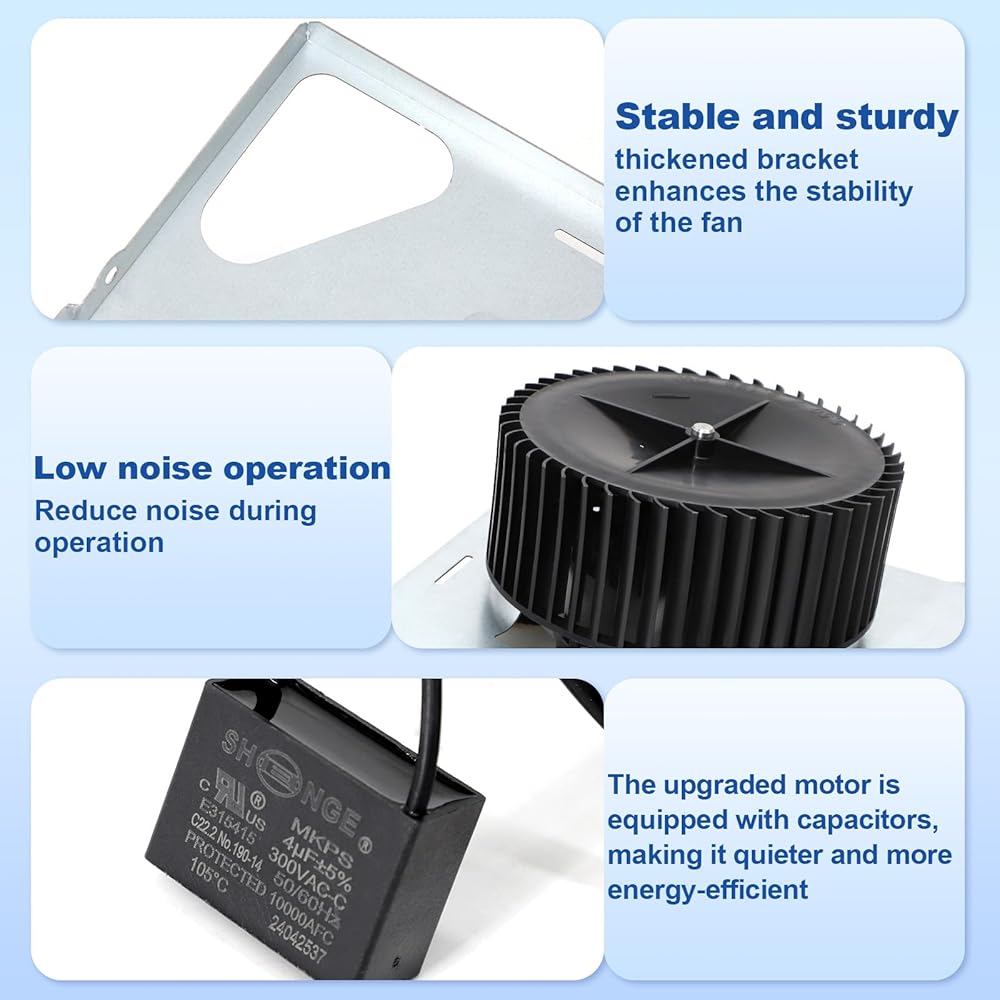 تصميم صامت: تم تحسين تصميم المحرك لتشغيل منخفض الضوضاء وهادئ وغير مزعج. بفضل الأداء القوي والضوضاء المنخفضة، فإنه يعزز تجربة حمامك. المواصفات: الجهد الكهربي: 120 فولت، تدفق الهواء: 110 قدم مكعب في الدقيقة، الدورات: 60 هرتز، الدوران: CCW، الأمبير: 0.48 أمبير