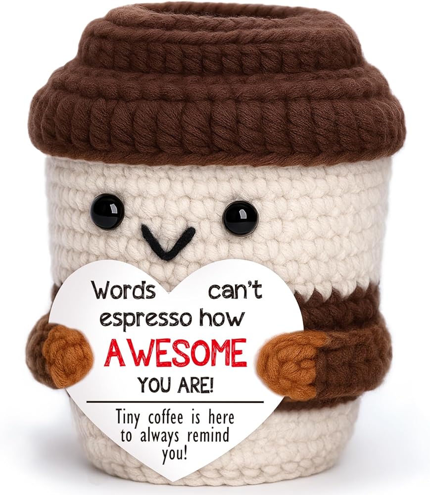 Gratitude tastes better when it's coffee-flavored. This crochet mini coffee cup carries a friendly line—“Just wanted to espresso how much you are appreciated!”—so you can recognize effort without sounding formal. It's a natural pick for thank you gifts, thoughtful coworker gifts, and teacher appreciation gifts from students or parents. It also suits service heroes—great nurse appreciation gifts, a kind volunteer thank-you, or a quick “you matter” for mentors and coaches. Use it for self-care too. Set the mini cup beside your keyboard as motivational desk decor, a constant positive reminder, and a simple daily affirmation between tasks. At home, it lives where caffeine lives: on a coffee bar, coffee station, or tiered tray; it also looks sweet on a kitchen counter, bookshelf, or mantel, adding a little warmth without taking space. Gifting is easy across seasons. The compact size slips into stockings as stocking stuffers for coffee lovers, tucks into a holiday gift basket stuffer, and wins smiles at swaps like Secret Santa coffee gifts and white elephant gifts. Beyond the holidays, it works for milestones—graduation, new job and promotion gifts, Boss Day gift, or simple thinking of you and just because moments. Coffee fans and baristas will love the theme, making it a charming option for gifts for coffee lovers as well. Handmade with cozy stitches, each piece has slight variations that make it uniquely yours—like a personalized brew. Keep this tiny cup as your daily pep talk, or share it with the people who keep things perking along. Decoration only; not edible.