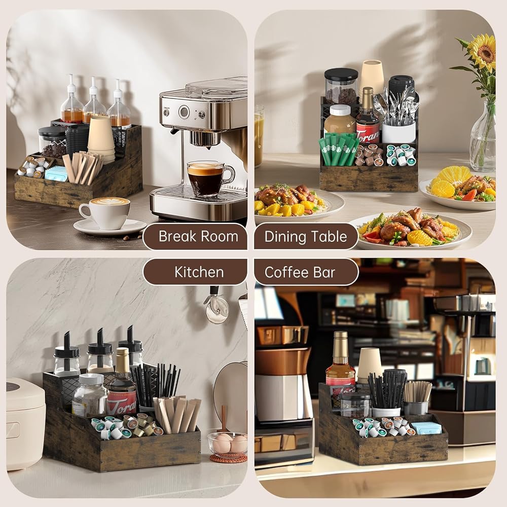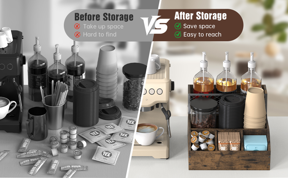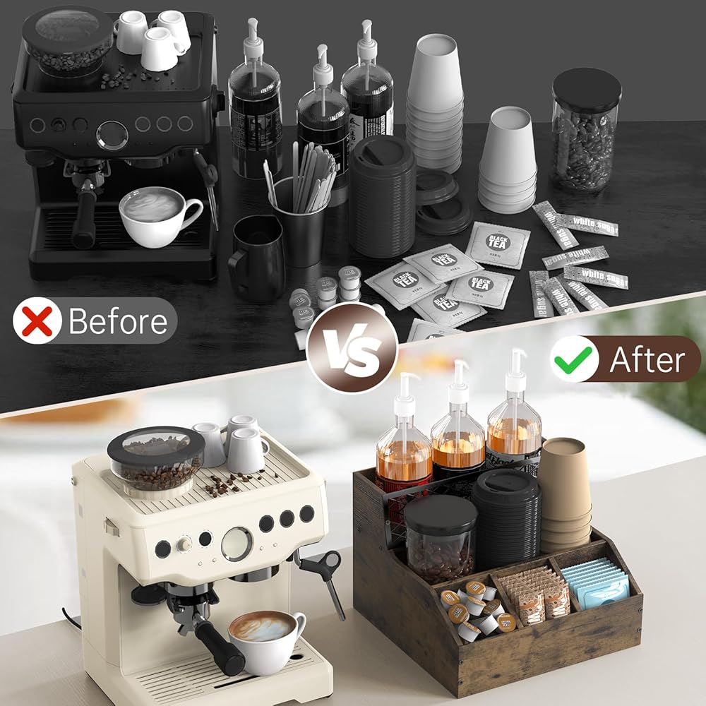 َ 𝗦𝘁𝗼𝗿𝗮𝗴𝗲: تتيح ملحقات القهوة إمكانية التخزين المنظم والفعال في الفئات. تحتوي المقصورات الأمامية الثلاثة على أكياس الشاي وكبسولات القهوة وغيرها من الأشياء الصغيرة. يمكن أن تحتوي المساحة الوسطى الكبيرة على كبسولات القهوة والبسكويت والحليب وحزم السكر والأدوات والمناشف الورقية وحبوب القهوة وما إلى ذلك. مساحة السلم العلوي تحتوي على 3 زجاجات من شراب القهوة سعة 750 مل.