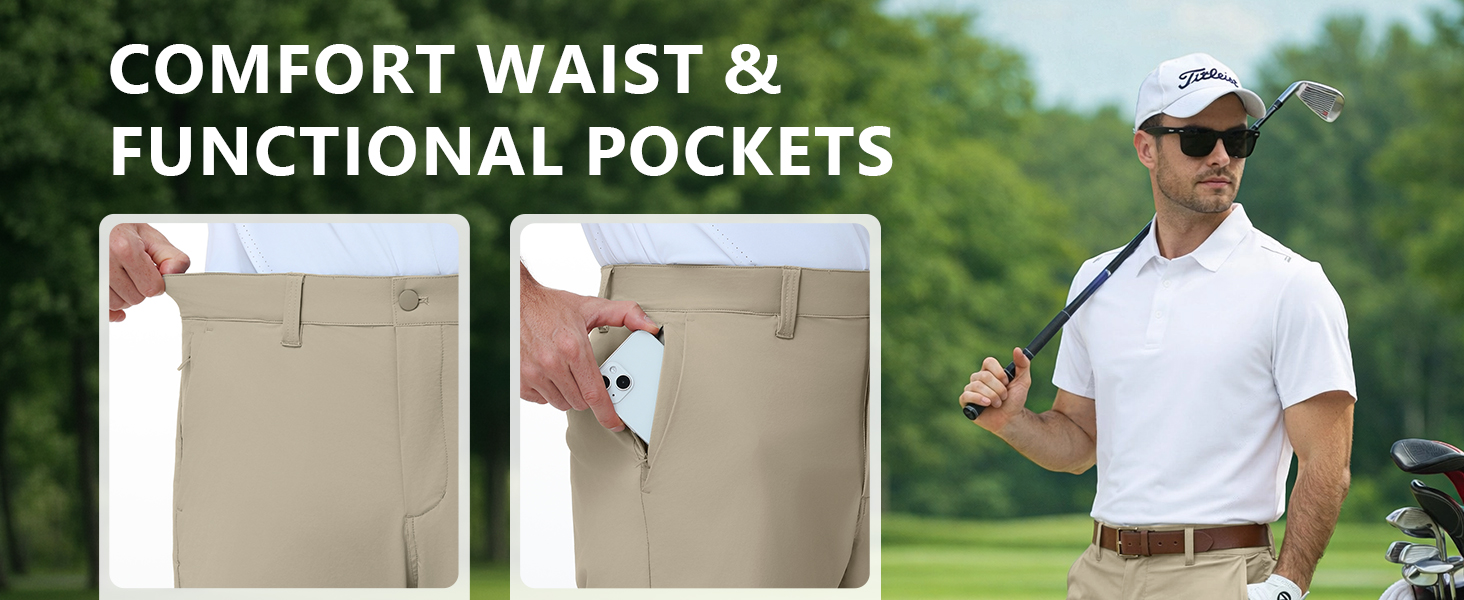 طراز تقليدي مع مساحة تخزين عملية - يتميز بخمسة جيوب عملية، بما في ذلك جيوب أمامية بسحابات مخفية لتخزين كرات الجولف أو التيشيرتات أو الهاتف أو المفاتيح بشكل آمن، بالإضافة إلى جيبين خلفيين بزر إغلاق لسهولة الوصول ومظهر جولف نظيف لا يتأثر بمرور الزمن.