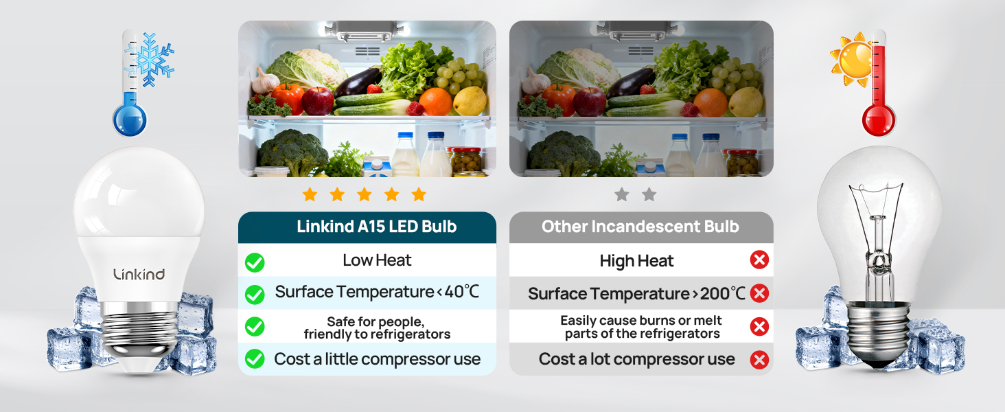 【لمبة بدون حرارة للثلاجة】مصابيح إضاءة الثلاجة Linkind A15 مصنوعة من مواد مقاومة للماء IP54 ومصابيح LED مدمجة ممتازة، تمكن من العمل بعد -4 درجة فهرنهايت -104 درجة فهرنهايت (-20 درجة مئوية -40 درجة مئوية). مصابيح إضاءة الثلاجة A15 هذه مصممة لأضواء الثلاجة بدون حرارة، وهي صديقة للثلاجة عن طريق تقليل تراكم الحرارة، مما يساعد في الحفاظ على كفاءة التبريد المثالية
