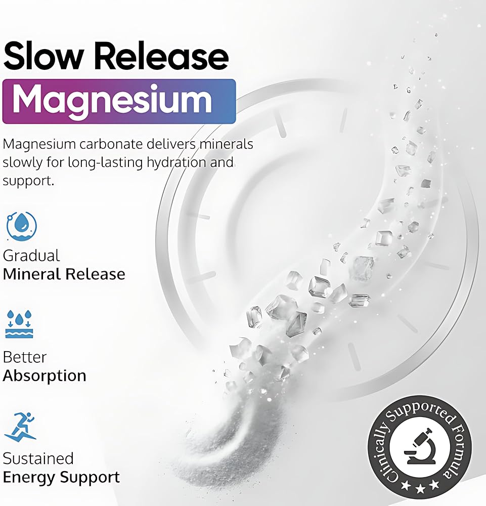 طاقة مستدامة وصديقة للمعدة - توفر كربونات المغنيسيوم بطيئة الإطلاق تدريجيًا المعادن الأساسية للترطيب ودعم العضلات طوال اليوم.