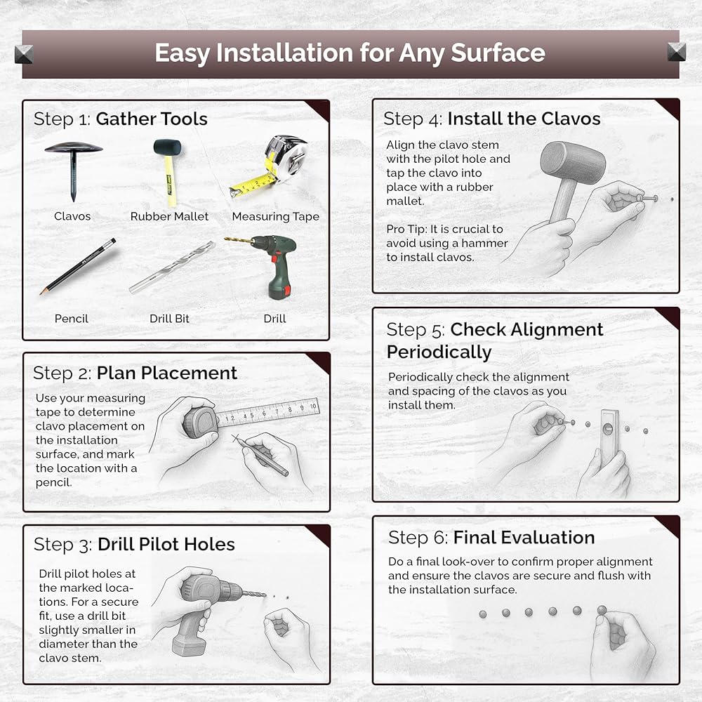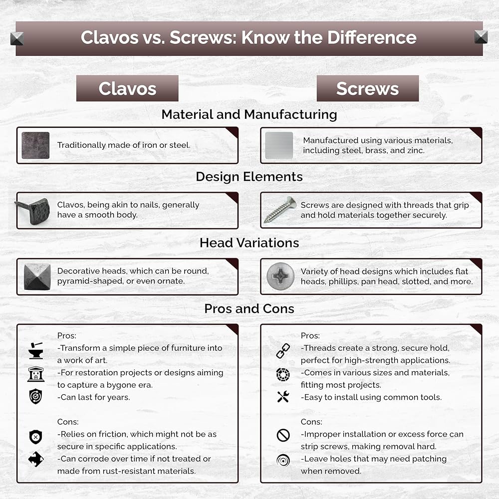 • Premium quality, these are not weak upholstery tacks, nail shank is 1/8" thick and 1" long. Don't be fooled by clavos being sold with "thin needle-like" nails.