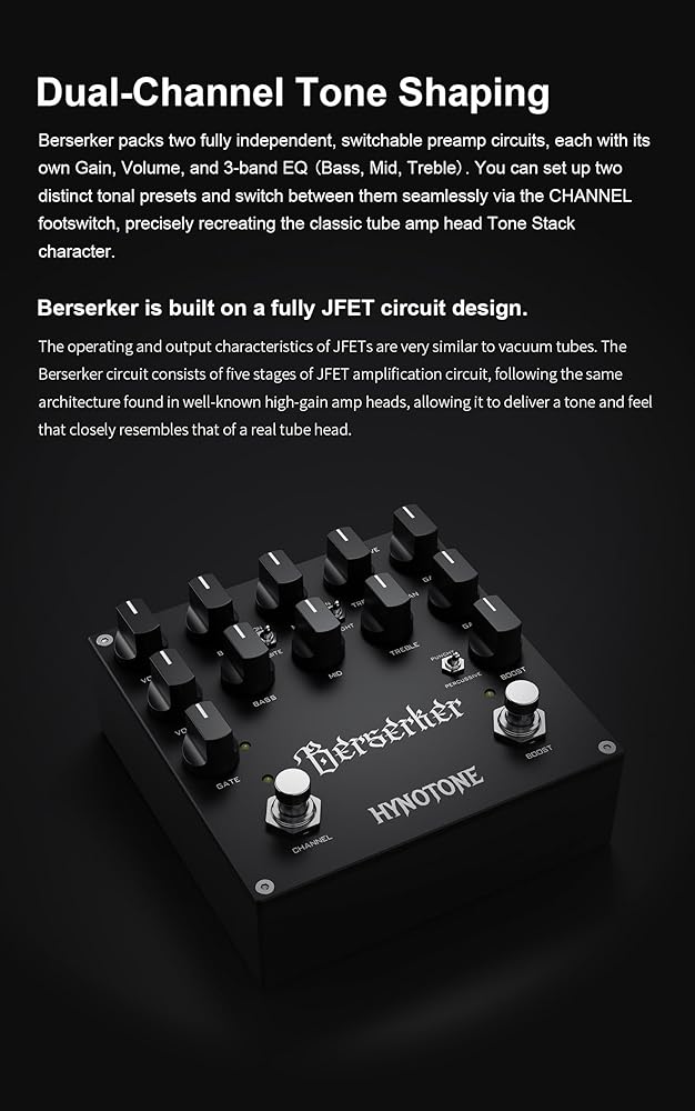 • 【بنية JFET بالكامل لإحساس يشبه الأنبوب الحقيقي】 تم تصميم Berserker بالكامل على تصميم تضخيم JFET من خمس مراحل، وهو يكرر بشكل وثيق سلوك تشغيل الأنابيب المفرغة. والنتيجة هي استجابة مضخم صوت أصلية، وضغط طبيعي، وحساسية لمس ديناميكية يمكن مقارنتها برؤوس مضخم الصوت الأنبوبية عالية الكسب.