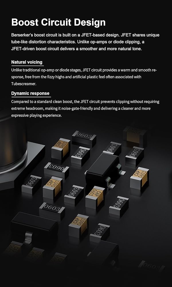 • 【دائرة تعزيز JFET - سلسة وموسيقية وديناميكية 】 على عكس تعزيزات قطع المضخم التشغيلي أو الصمام الثنائي، يوفر التعزيز المعتمد على JFET تشبعًا دافئًا وطبيعيًا دون ارتفاعات قاسية أو مصنوعات "بلاستيكية". إنه يعزز الوضوح واللكمة بينما يظل صديقًا لبوابة الضوضاء، ويحافظ على ديناميكيات اللعب التعبيرية.