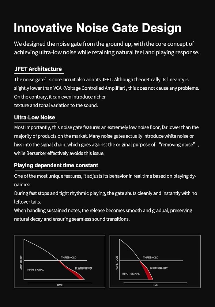 • 【تصميم مبتكر لبوابة الضوضاء المنخفضة للغاية】 تم تصميم بوابة الضوضاء من Berserker من الألف إلى الياء، وتستخدم نواة JFET لأداء منخفض الضوضاء للغاية - دون إدخال هسهسة أو ضوضاء بيضاء. إنه يحافظ على النغمات عالية الكسب مشدودة وصامتة مع الحفاظ على الملمس الطبيعي والملمس اللوني.