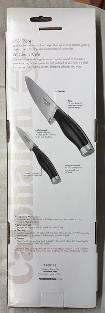 3½ 2" Parer Ideal for the finer tasks of food preparation like mincing shallots, peeling apples, coring tomatoes and creating beautiful garnishes. 6" Chef's Knife The chef's knife blade is gently curved from tip to heel, to facilitate a smooth rocking motion against the cutting board as you work. It's ideal for mincing garlic, dicing chicken, chopping cabbage and more. Fully Forged One piece foraing of blade, bolster and tang for life-long durability. Full tang design fo better balance and superior strength. Each piece labeled for easy identification ono reduced weon on blade. uniquely countered for a one size fit all comfort Before each use: Sharpen the blade to make it easier and safer to use. * Cleaning: Carefully wipe clean with sudsy cloth and rinse after each use. ALWAYS wipe dry immediately. Do not clean in a dishwasher or allow to soak. * Storage: ALWAYS store in a cutlery block to preserve the cutting edges and protect hands from unnecessary contact with blade