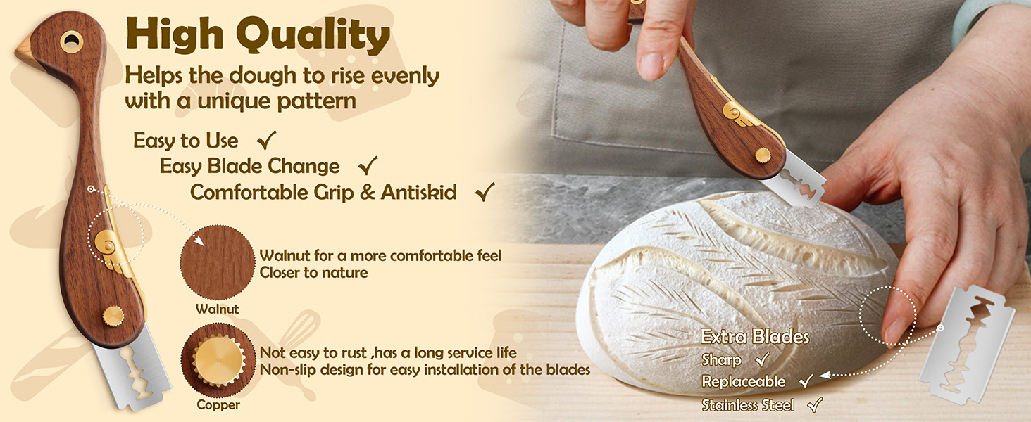 مقبض خشبي مريح لقبضة فائقة - يوفر المقبض الخشبي قبضة ناعمة ومريحة، مما يجعل من السهل الإمساك والتحكم أثناء عملية التسجيل. توفر هذه السكين الخشبية للعجين المخمر التوازن المثالي للاستخدام السهل.
