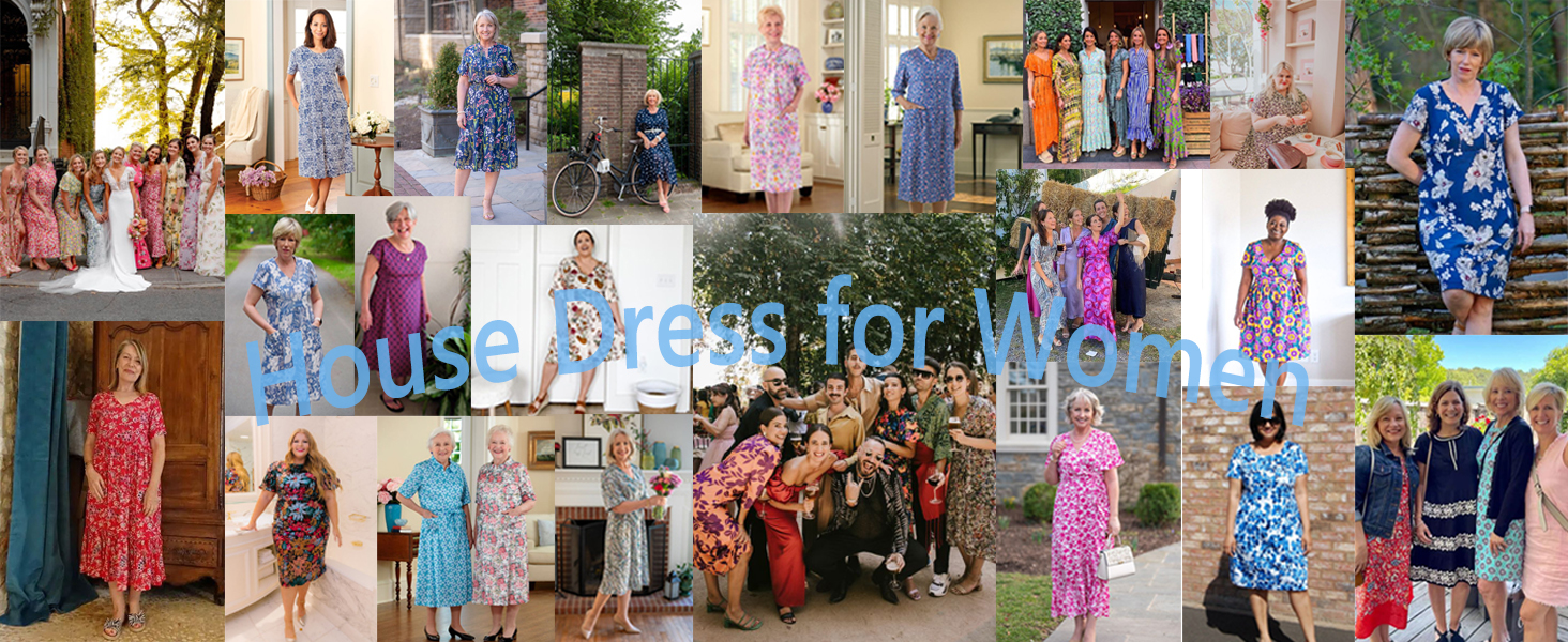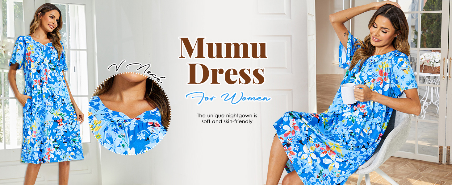 【خامة مريحة】 فستان مو مو المنزلي للسيدات مصنوع من 95% بوليستر و5% ألياف لدنة، ناعم، خفيف الوزن، قابل للتمدد، صديق للجلد ولن يتجعد أو ينكمش أو يبهت أثناء الغسيل، مثالي جدًا لفساتين المنزل Muumuu ملابس مريحة حول المنزل أو النوم.