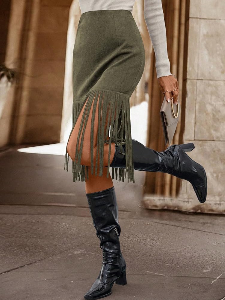 • السمات: خصر مرتفع، زخرفة شرابة، طول تحت الركبة، تنورة بشراشيب لراعية البقر