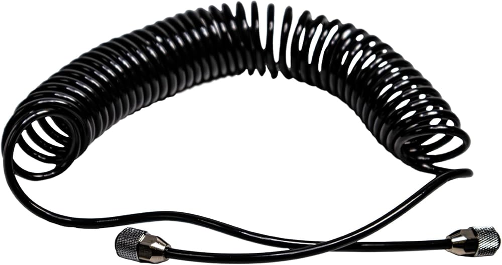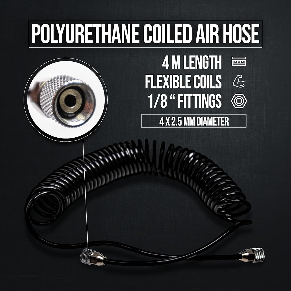 1/8" - 1/8" Black Polyurethane Coiled Air Hose by NO-NAME Brand Length: 4m (13') Diameter: 4x2.5mm Fittings: 1/8" Coiled Air Hoses are great in combination with tank-less compressors as they can help with the pulsations.