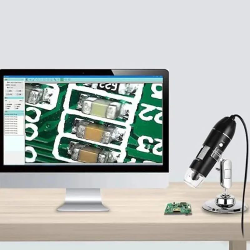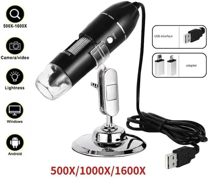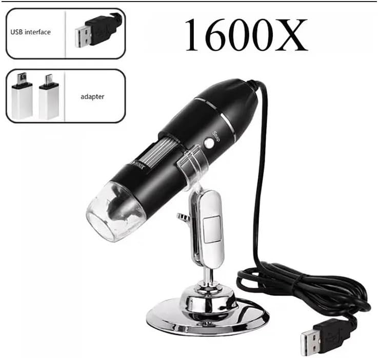 Discover the microscopic world in stunning detail with this powerful 1600X digital microscope. This versatile USB microscope features a sleek black design with chrome accents and comes complete with a stable metal stand for precise focusing. The high-magnification lens system lets you examine intricate details perfect for soldering work, circuit board inspection, and mobile phone repairs. The microscope connects easily via USB interface and includes handy adapters for broad compatibility. Its adjustable stand allows for flexible positioning while maintaining steady focus. The built-in LED illumination ensures your subjects are perfectly lit for clear viewing. Whether you're a hobbyist, repair technician, or curious explorer, this portable digital microscope brings the invisible world into sharp focus right on your screen. The durable construction and precision optics make it an invaluable tool for detailed inspection and analysis work.