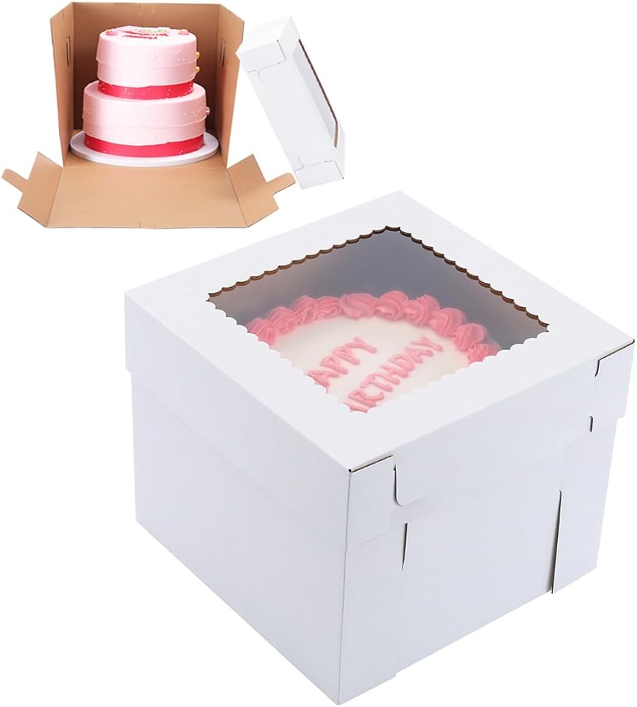صناديق كعكة طويلة للكعك، 12 × 12 × 10 بوصة [10 عبوات] صندوق خبز قوي وسميك مع نافذة، حامل كعكة أبيض، حاويات كعكة للاستعمال مرة واحدة، صناديق كعكة عيد الميلاد