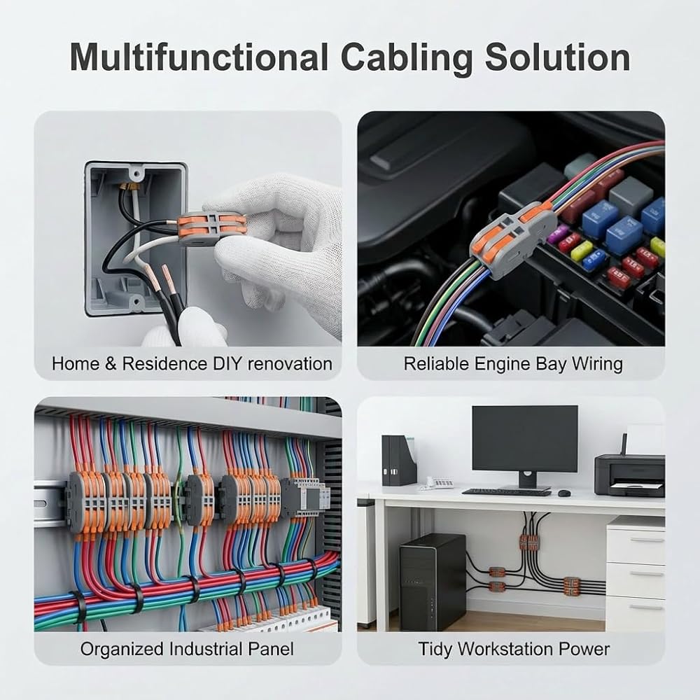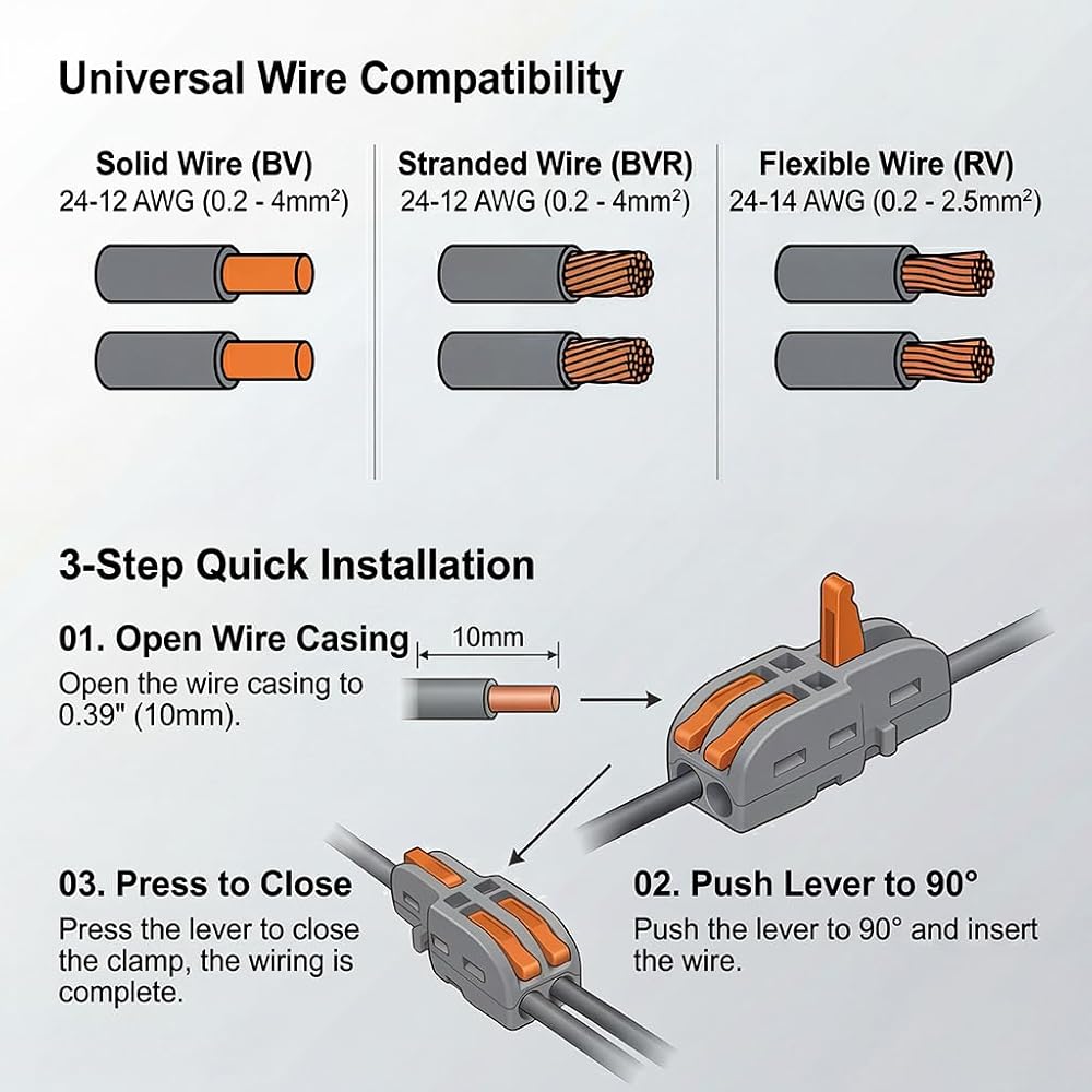 Works with both solid and stranded wires across multiple gauges, making it suitable for home wiring, automotive applications, lighting fixtures, switches, and electronics projects.