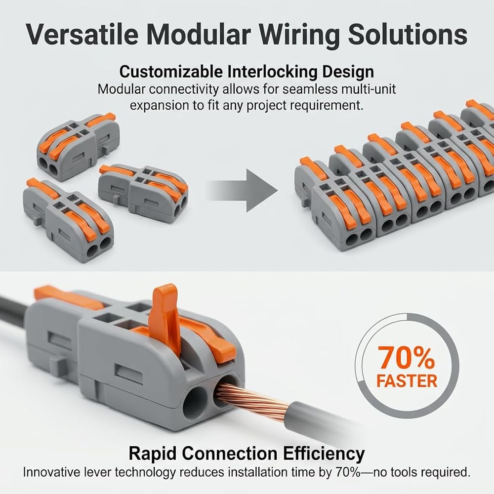 Designed as 1-to-2 wire connectors, each unit can also be combined into 2-to-1 splice connectors or expanded into multi-way configurations, offering high versatility for various wiring setups.