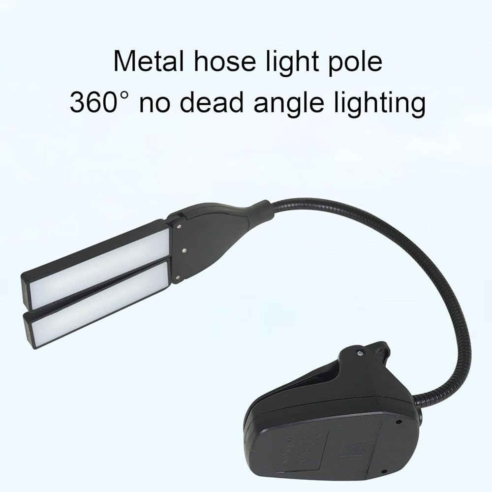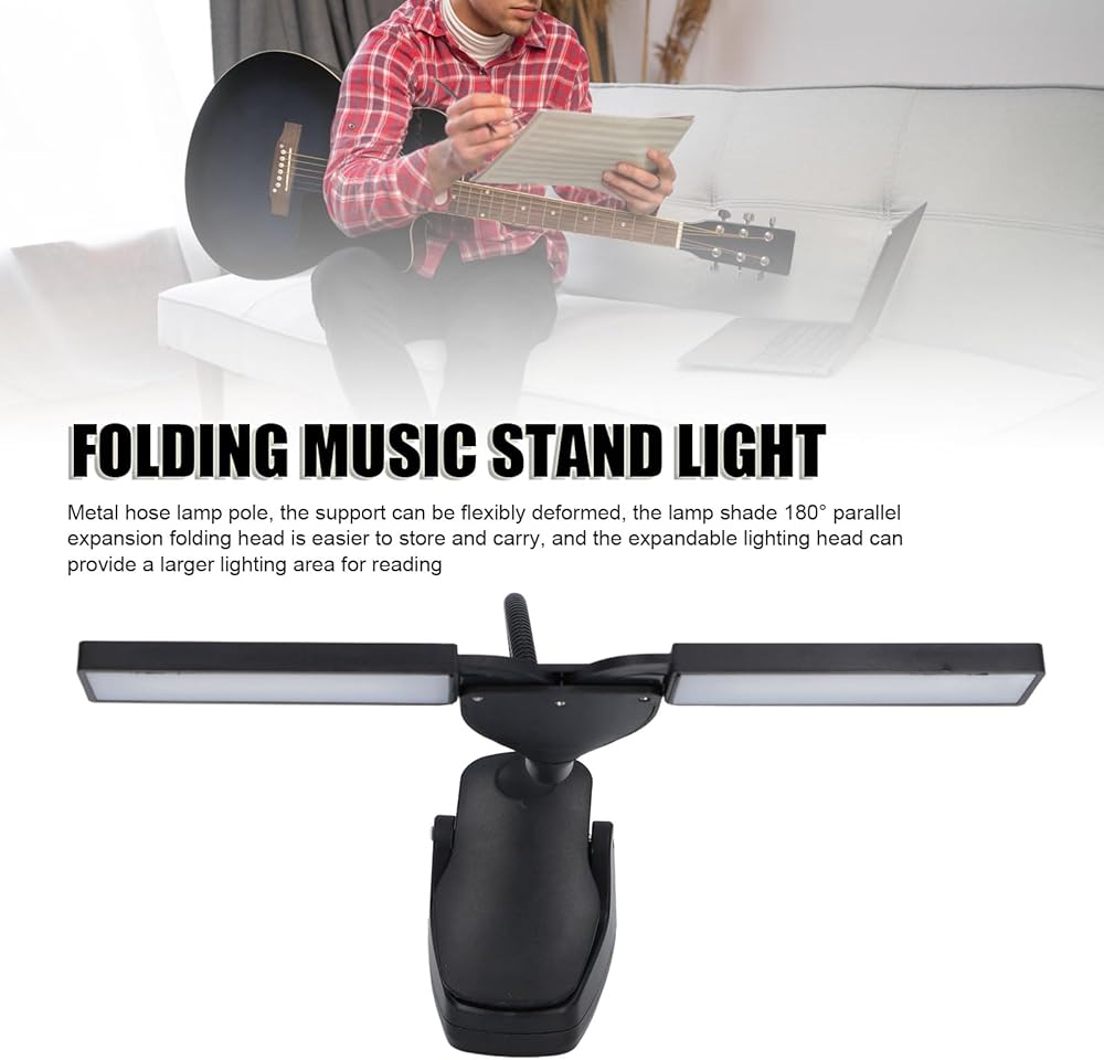 4. POWER SUPPLY: Folding music stand light support two power supply methods: battery(not included) and USB, get rid of the trouble of traditional wires. USB cable can connect the computer host, charging bank, mobile power supply, more convenient to use