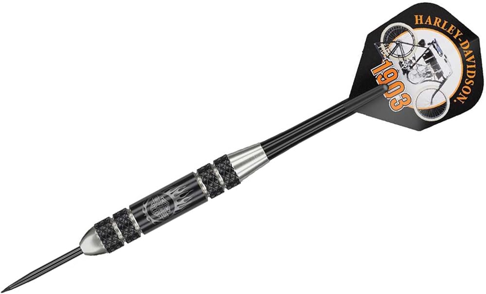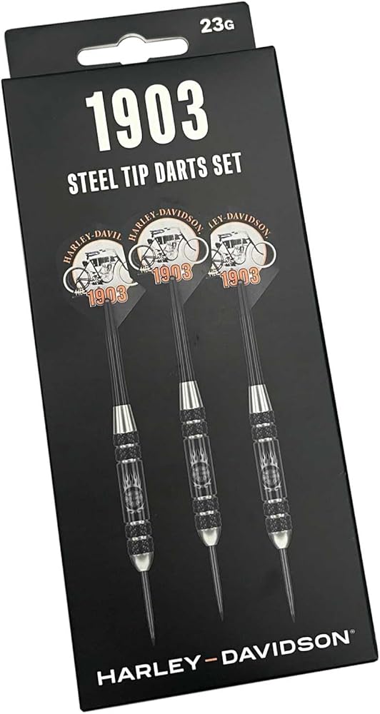 Harley-Davidson 1903 Darts, 61356. 22 gram Steel Tip Darts. Precision meets legacy: Harley-Davidson inspired darts crafted to honor the 1903 motorcycle. Includes 6 1903 flights and 6 1903 shafts. Tri-fold dart wallet. Black coated stainless steel barrels. Laser engraved Bar & Shield. The perfect darts for your at home board!