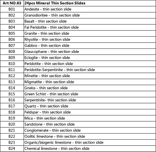 24pcs/set Geology Microscope Prepared Slides Mineral Thin Section Slides Please description reference pictures list. microscope slide 76 x 25x (1-1.2mm), cover glass slides thickness 0.17mm, rock and mineral material thickness 0.03mm. product size has positive or negative difference, please refer to the actual size of the actual object. Please pictures and list are only for information, please take the actual product as the standard. Fragile products, please handle gently.